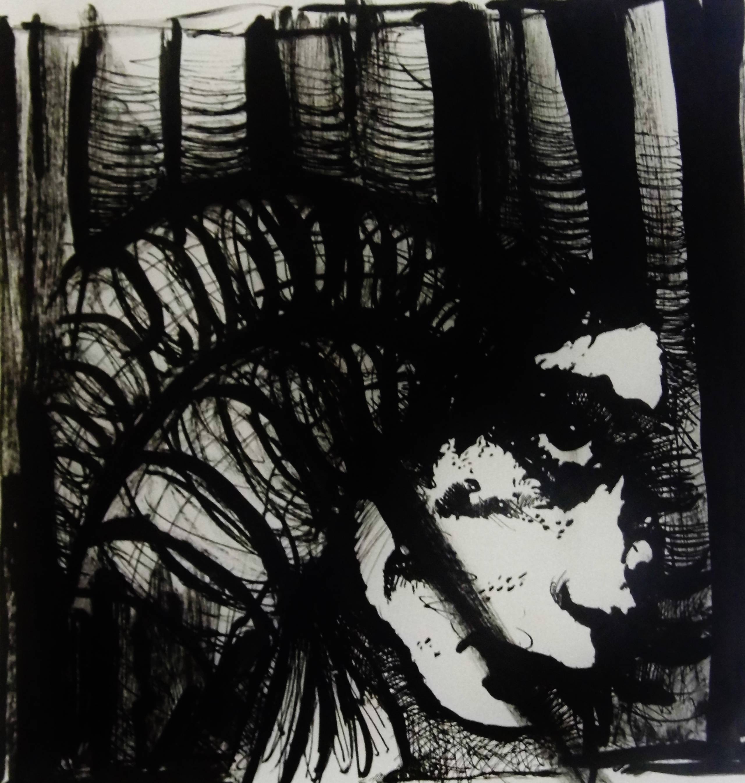 Mała forma graficzna wykonana na papierze przy użyciu tuszu kreślarskiego