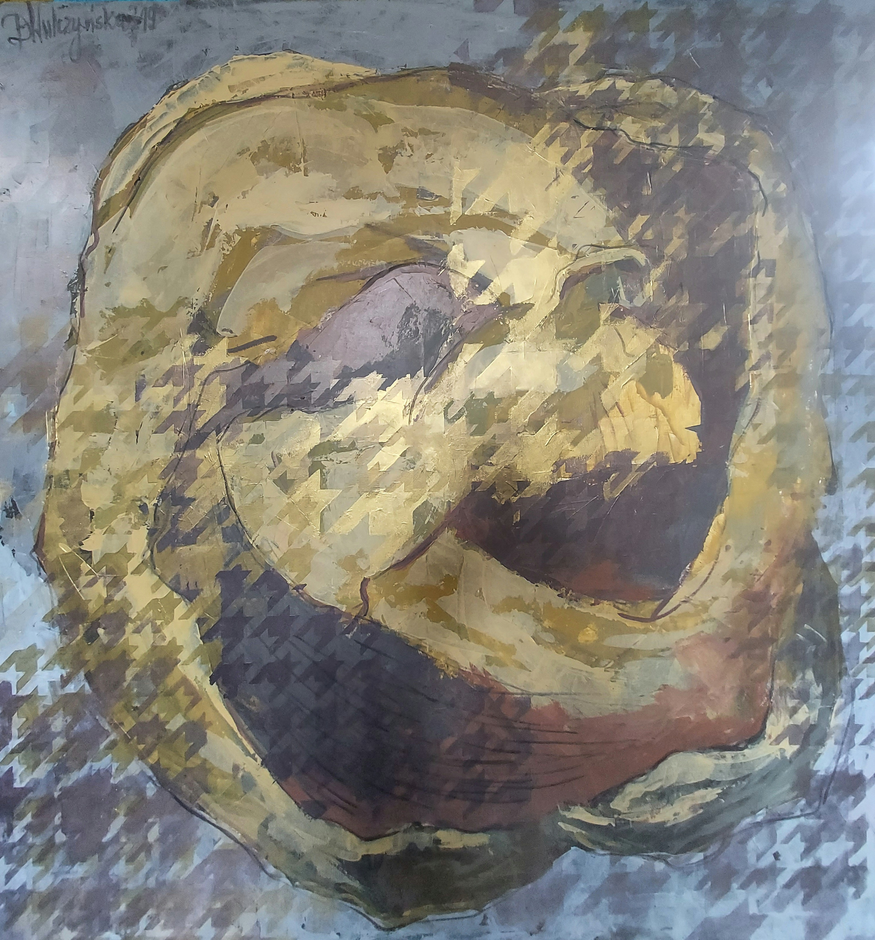 Kobieta i mężczyzna w miłosnym, dynamicznym wirowaniu-splątaniu. Dominujące odcienie złota i brązu, tworzą ,, zwój ,, na kształt postaci, na tle stonowanych szarości i błękitów, obrazując moment ruchu. Styl obrazu jest abstrakcyjny, co dodaje mu tajemniczości i zmusza do refleksji nad jego głębszym znaczeniem. Zostały do namalowania wykorzystane techniki mieszane, co uwidacznia się w różnorodności tekstur i subtelnym łączeniu kolorów. Szczotkowanie, plamy farby i delikatne, aczkolwiek celowo niestarannie nałożone pociągnięcia pędzla współgrają ze sobą, tworząc wrażenie kontrolowanego zamętu. Atmosfera obrazu jest jednocześnie spokojna i niepokojąca. Daje poczucie zawirowania, a jednocześnie budzi refleksję nad ulotnością chwili. Emocjonalnie obraz może wywoływać poczucie tajemnicy lub nostalgii, skłaniając do osobistego wglądu.
