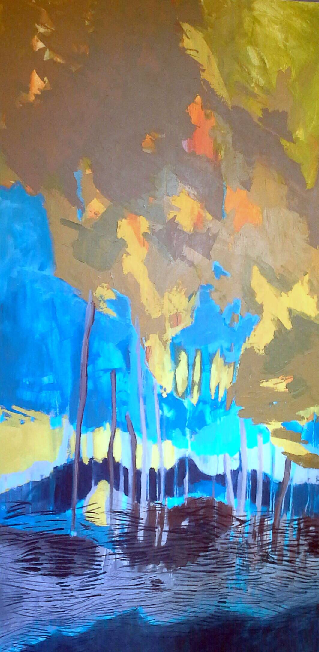 Na obrazie dominują żywe kolory takie jak mocne błękity i żółcie, przenikające się z cieplejszymi odcieniami brązów i zieleni. Kompozycja przypomina abstrakcyjne drzewa osadzone w krajobrazie pełnym emocji. Gałązki kierują się ku niebu, co nadaje dynamikę całemu dziełu. Atmosfera jest pełna tajemnicy oraz pewnego rodzaju spokoju, jak ciche popołudnie na brzegu lasu. Technika artystyczna sugeruje użycie energicznych pociągnięć pędzla, co dodaje wrażenia ruchu i życia. "Wow!", pomyślałoby dziecko, "te drzewa są jak z bajki!" Styl artysty łączy w sobie impresjonizm z nutką ekspresjonizmu, tworząc wyjątkową mieszankę. Obraz może wywołać u odbiorcy refleksje o ulotności chwili i pięknie natury, ale też nostalgia—jakby to było zapomniane wspomnienie. Głębokie linie na dole obrazu przyciągają wzrok i prowadzą do wewnętrznych refleksji. Każdy patrzący może poczuć, że jest częścią tego magicznego "moment" w czasie.