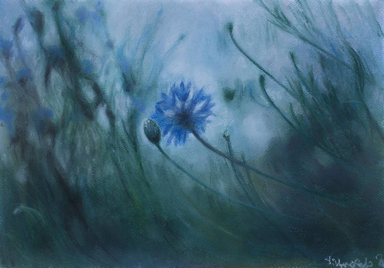 Obraz ukazuje delikatny świat roślin, w którym dominuje niebieska tonacja, przeplatana subtelnie zielenią. Centralnym punktem jest wyraźnie zarysowany chaber, który wydaje się tańczyć na wietrze. Rozmyte tło dodaje aurze mistycyzmu, sprawiając wrażenie, jakbyśmy spoglądali na scenę przez muślinowy welon. Atmosfera jest spokojna i melancholijna, jakby zaczerpnięta z marzenia sennego. Artysta stosując miękkie pociągnięcia pędzla i delikatne przejścia kolorystyczne, osiągnął efekt impresjonistycznego rozmycia. To ten typ obrazu, który zmusza do przemyśleń i daje chwilę wytchnienia od codziennego zgiełku. Coś jak "a moment of peace" w obrazkach na Pintereście, rozumiesz? Obraz może przywołać wspomnienia spacerów po letnich polach, kiedy czas płynął wolniej. Plama koloru to trochę jak uśmiech mamy. To, jak natura potrafi być jednocześnie piękna i ulotna, skłania do refleksji nad chwilowością życia. Dla mnie, to jak przytulenie w deszczowy dzień.