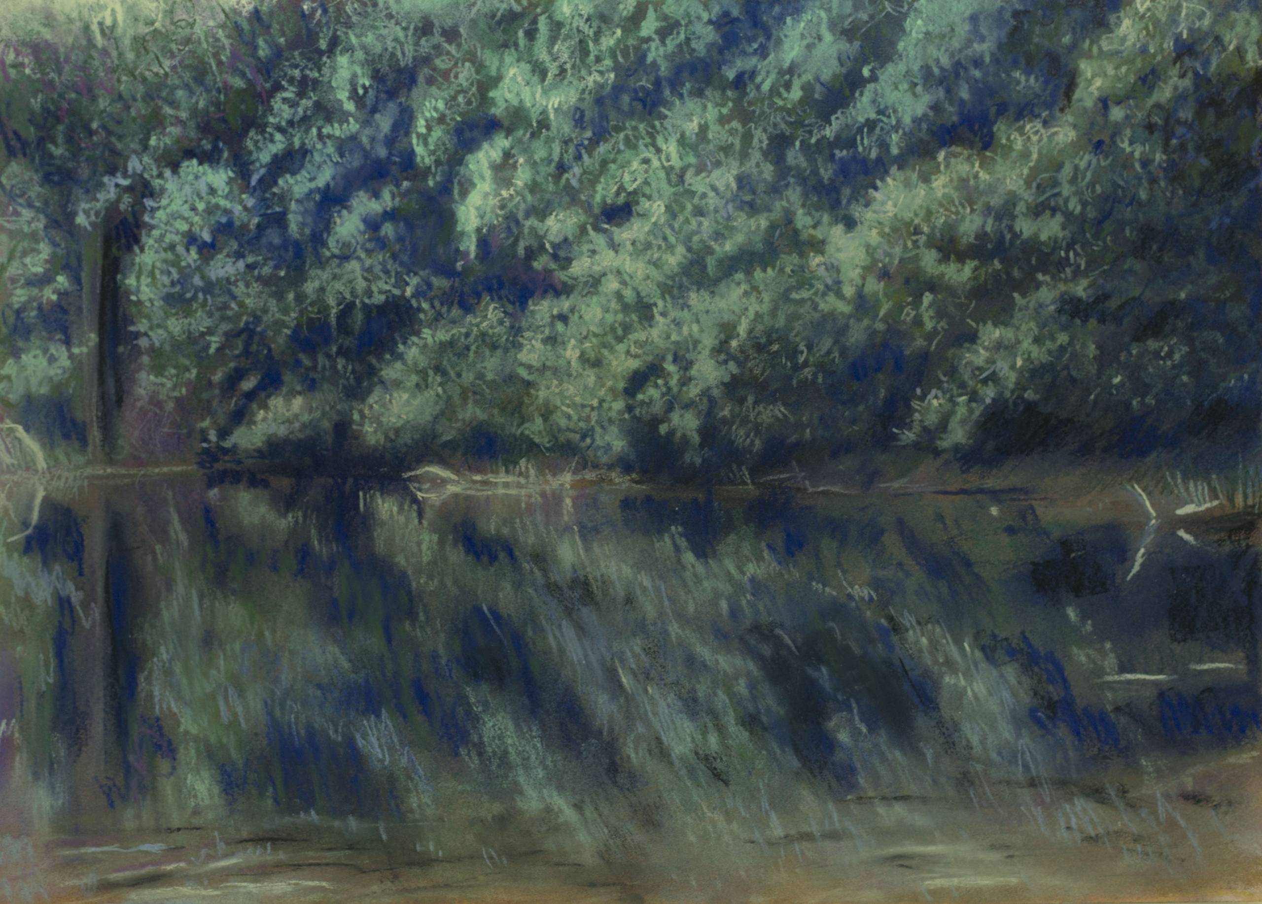 Na obrazie widać spokojne odbicie zielonego lasu w lustrzanej tafli wody. Kolory są delikatne, z przewagą zieleni i błękitu, które tworzą harmonijną kompozycję. Cienie drzew rozmywają się, nadając pejzażowi tajemniczy nastrój. Wydaje się, że można usłyszeć szum liści i poczuć świeżość powietrza. Technika zastosowana przez artystę to prawdopodobnie pastel lub farba olejna, co dodaje miękkości i łagodności całemu obrazowi. Patrzę na to miejsce i czuję spokój. Jakby czas stanął w miejscu, a świat zatrzymał się na chwilę oddechu. Kiedy patrzę na ten obraz, myślę sobie, że to idealne miejsce na chwilę refleksji. Ta sielanka może wzbudzić w widzu poczucie 'peace', jak angielskie słowo dla pokoju. Obraz przywołuje wspomnienia dzieciństwa, gdy wpatrywałem się w wodę, myśląc, że dotknę życia pod nią. Drzewka są duże i zielone. To dzieło skłania do chwilowej ucieczki od zgiełku codzienności.