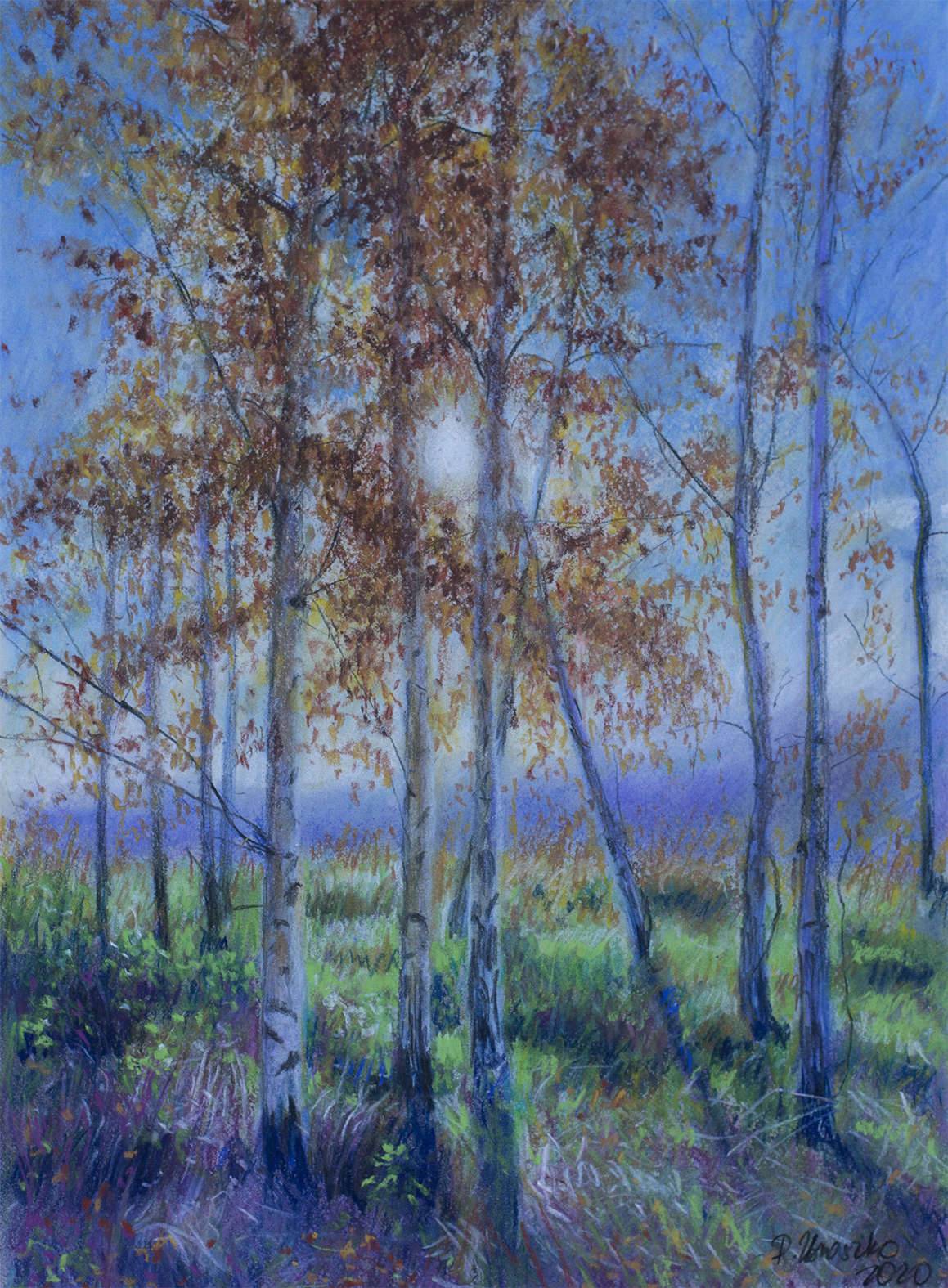 Obraz przedstawia uroczy pejzaż zdominowany przez wysokie, smukłe drzewa z delikatnymi, rudymi liśćmi. Tło skąpane jest w odcieniach błękitu i zieleni, a światło przebijające się przez korony drzew nadaje scenie eteryczną aurę. Kompozycja jest spójna, z centralnie usytuowanymi pniami drzew, które przyciągają wzrok. Atmosfera dzieła jest spokojna, niemal hipnotyzująca, przypomina beztroskie spacery po lesie w chłodny, jesienny poranek. Użyta technika, prawdopodobnie pastelowa, dodaje miękkości i głębi, sprawiając, że kolory zdają się subtelnie przenikać. Obraz może wywoływać uczucie nostalgii i ciepła, prowokując do refleksji nad zmieniającymi się porami roku i cyklem życia. "Wow!" pomyślałby mały widz, przypominając sobie wycieczki do parku. Niesamowite, jak sztuka potrafi uchwycić chwilę, prawda? Patrząc na te drzewa, niemal czuć szelest liści i zapach wilgotnej ziemi. To takie magiczne doświadczenie, które translator nie odda. Podejście artysty do uchwycenia światła i cienia wskazuje na jego mistrzostwo.