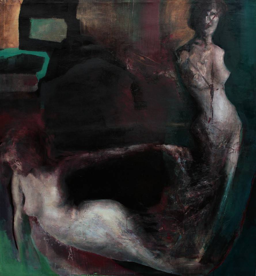 Metamorphoses, oil on canvas, 150x150 cm, 2007 Two women, or rather one, suspended in postorganic world which no longer exist or manifest itself, but it still leaves a luminous, geometric structure in the painting, which is its echo. The woman on the left, lying like a baroque marble statue, is a physical vessel to the second women, to which she draws her hand. These women are like sisters, whose souls merged into one. Metamorfozy, olej na płótnie, 150x150 cm, 2007 Dwie kobiety, a raczej jedna, zawieszone w postorganicznym świecie czyli takim, który już nie istnieje, ale jeszcze pozostawia po sobie świetliste, zgeometryzowane struktury, będące jego echem. Kobieta leżąca, niczym barokowy marmurowy posąg, jest fizycznym naczyniem tej, do której wyciąga dłoń. Kobiety te są jak siostry, których dusze połączyły się w jedną elementem. zochowska.com