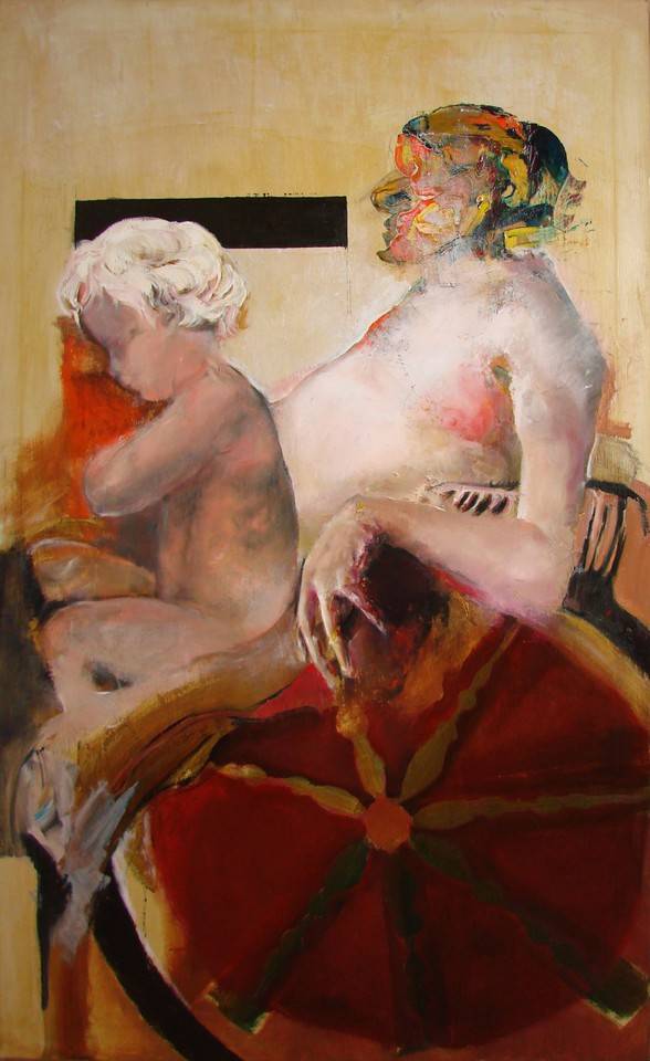 Scena rodzinna. Dziadek z wnuczkiem na fotelu bujanym. Alegoria młodości i starości, naiwności i wiedzy.