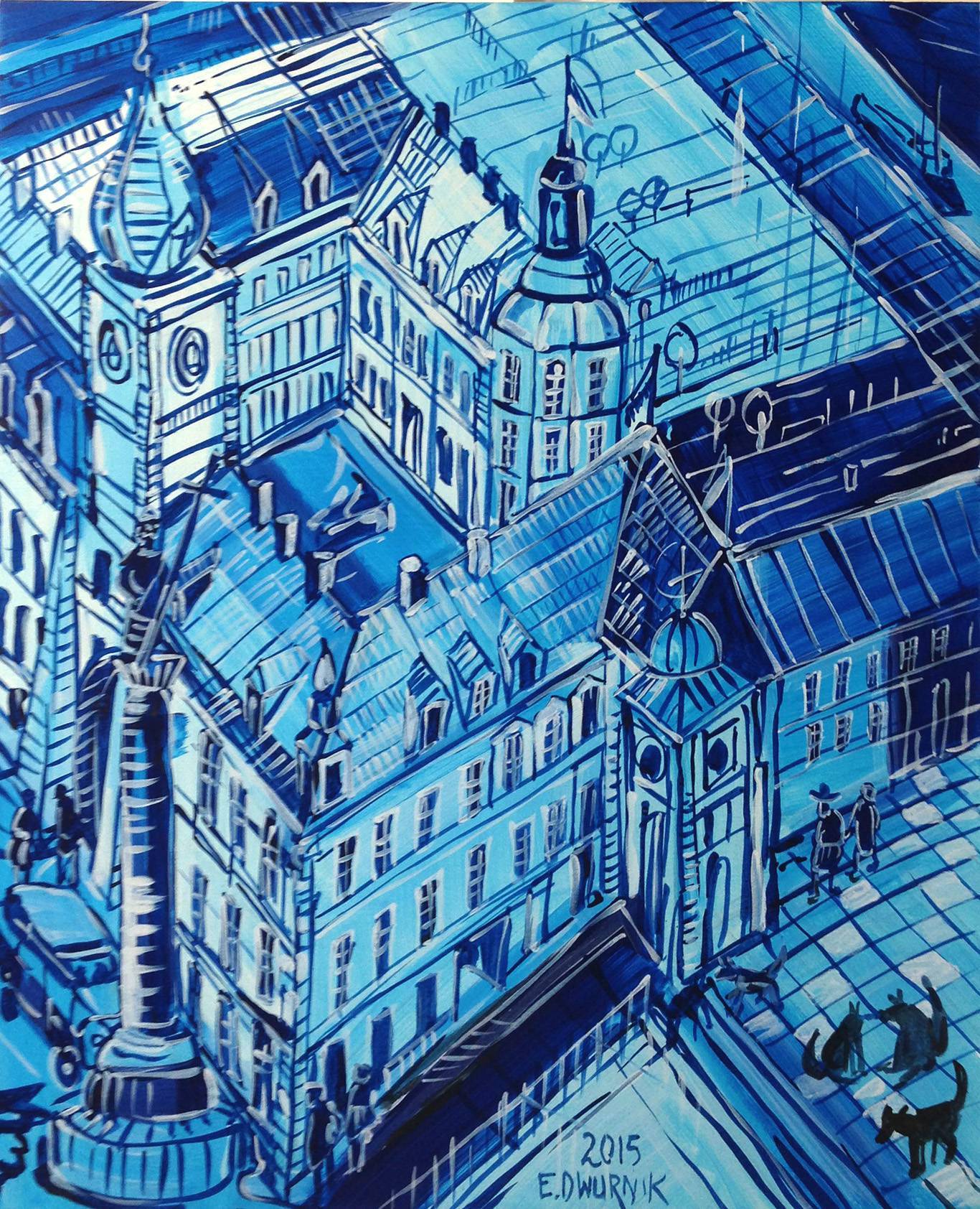 Obraz wibruje wieloma odcieniami koloru niebieskiego. Czuć dreszcz chłodnego poranka. Budynki ukształtowane są jak złożona układanka, pełna geometrycznych form i skomplikowanych detali. Kompozycja, choć zatłoczona, ma w sobie porządek, a każde pociągnięcie pędzla wydaje się być starannie przemyślane. Wieżyczki i dachy, skierowane w różnych kierunkach, przywołują na myśl starą europejską architekturę. Kurcze, chciałbym tam być. Atmosfera jest intrygująca. Czas jakby stanął w miejscu, a wszystko wokół toczy się w magicznym rytmie. Artysta użył techniki reminiscent from cubism, z precyzyjnymi liniami i stylizowanym ruchem. Odbiorca może się zatracić w tej wizualnej symfonii, odnajdując spokój i harmonię. Może myślisz sobie, jak ja: „Co tam się kryje za tym rogiem?” Całość emanuje spokojem, ale i lekką tajemnicą. Praca ta jest jak puzzle marzeń, które mogą stać się częścią naszej wyobraźni. A na pewno nie jedno dziecko powiedziałoby: "Ten budynek jest jak z bajki!". I tak widzę to ja. Inspiracja i zaduma w jednym.
