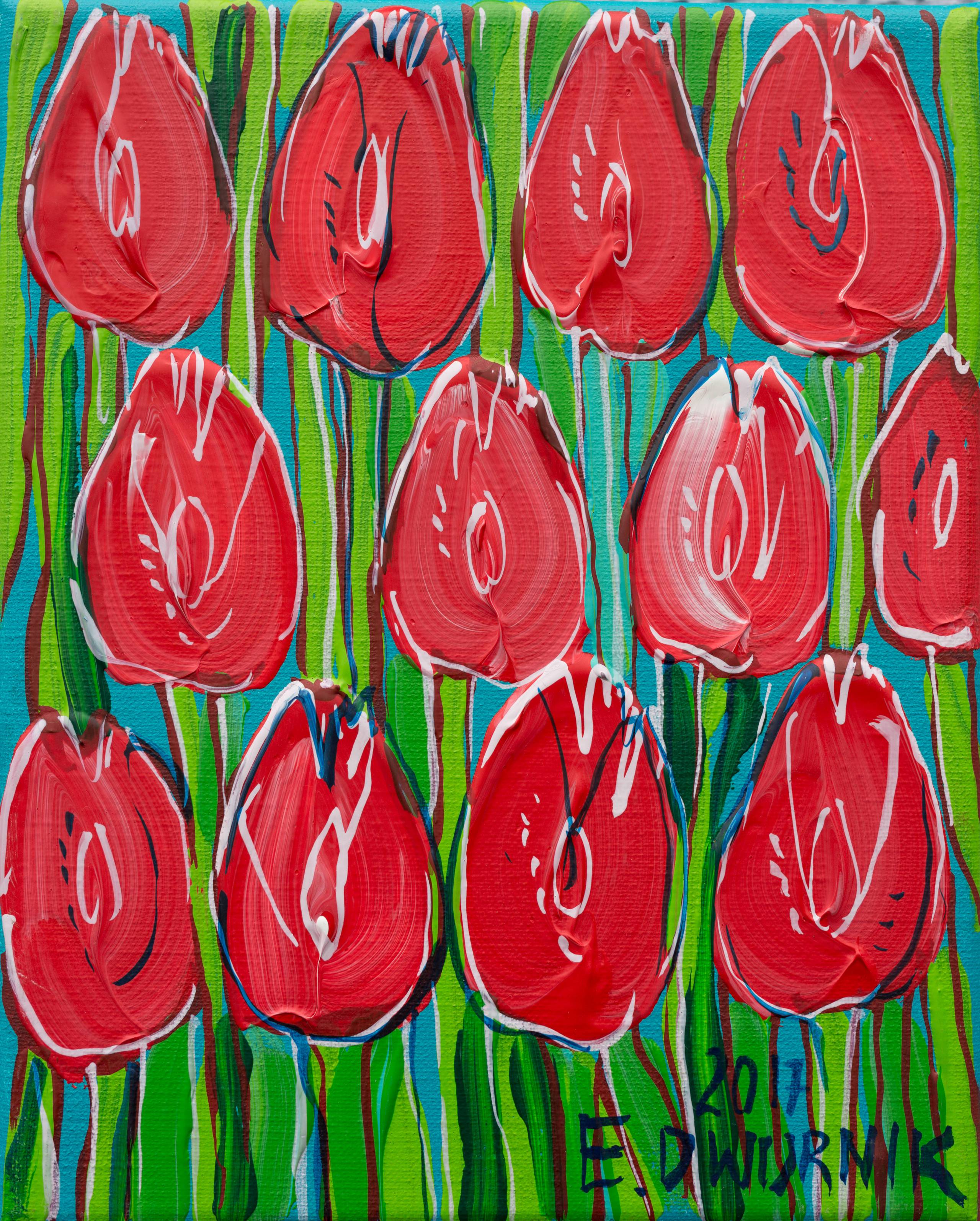 Obraz przedstawia kolorowe tulipany, jakby tańczyły w zielonym ogrodzie. Ich płatki są intensywnie czerwone, z odcieniami bieli, które podkreślają ich delikatność. Tło wypełniają żywe, zielone łodygi przeplatane błękitnymi akcentami, tworząc dynamiczną kompozycję. Mimo że kształty są proste, przyciągają wzrok swoją energią. Obraz emanuje radością i świeżością, jak wiosenny poranek. Artyście udało się uchwycić ruch i lekkość za pomocą techniki impasto, gdzie grubo nałożona farba dodaje tekstury. Styl dzieła jest odważny, niemal dziecinny, jak malowany bez ograniczeń i zasad. Można poczuć beztroskę i "freedom" w każdym uderzeniu pędzla. To przypomina rysunek dziecka, pełnego entuzjazmu: "Te kwiatki są jak czerwone baloniki, co nie chcą uciec z rączki!". Obraz pobudza do refleksji nad pięknem natury, prostotą i ulotnością chwili. Działa na emocje, wywołując uśmiech i tęsknotę za ciepłym, słonecznym dniem spędzonym w ogrodzie. Ten obraz to jak powrót do dzieciństwa, pełnego przygód i kolorów.