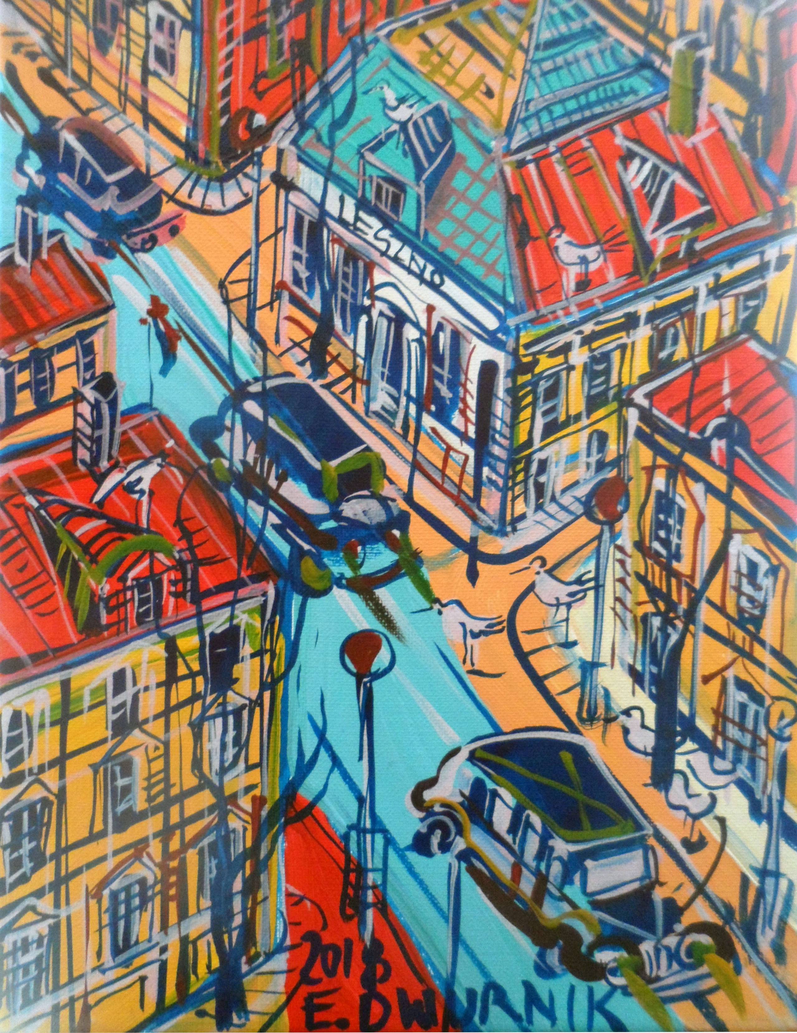Obraz przedstawia tętniące życiem miasto widziane z góry. Dominują intensywne kolory: głęboki błękit ulic, ciepłe odcienie czerwieni dachów i różnorodne odcienie żółci na fasadach budynków. Kompozycja jest dynamiczna, pełna linii i kształtów, które nadają dziełu ruch. Widać zgiełk ulicy z samochodami snującymi się jak małe, kolorowe pudełeczka. Artysta używa techniki, która przypomina rysunek markerem, co nadaje obrazowi dynamicznego charakteru. Nastrój jest żywiołowy, niemalże chaotyczny. Można tu poczuć Everyday Rush w miejskim życiu. Ciekawe, jak każdy budynek opowiada własną historię. Odbiorca może odczuwać ciekawość, a nawet lekki zawrót głowy od tej feerii barw i linii. Jest coś magicznego, a jednocześnie przytłaczającego w tym miejskim pejzażu. Tak jakby miasto żyło własnym życiem, pełne tajemnic do odkrycia. Czuć tu jednak symfonię, chaos zamienia się w harmonię. To są na pewno ulubione budynki jakiegoś dziecka. Artysta stworzył dzieło, które całkowicie przykuwa uwagę, zmuszając do zastanowienia się nad urokiem ulicznych zaułków.