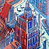 Obraz jest pełen dynamiki i intensywnych kolorów, a dominuje w nim czerwień i błękit. Architektura przedstawiona na nim przyciąga wzrok swoją geometryczną dokładnością, a budynki wydają się tańczyć między sobą. Centralnym punktem jest strzelista wieża, która dominuje w kompozycji. Ciepłe, czerwone odcienie przeplatają sie z chłodnym błękitem, tworząc magiczny kontrast. Atmosfera obrazu jest pełna życia. Artysta zastosował technikę przypominającą street art, co dodaje mu współczesnego charakteru. Grube pociągnięcia pędzla i mocne kontury nadają obrazowi wyrazistego wyrazu. Patrząc na ten obraz, można poczuć ekscytację miejskiego ruchu. "Look, a big red house!" może wykrzyknąć 7-latek, analizując kolaż barw i kształtów. Niesie on ze sobą poczucie odkrywania miejskiego krajobrazu, gdzie każdy kąt kryje nową tajemnicę. Wrażenie chaosu i harmonii jednocześnie sprawia, że wydaje się, że artysta bawi się perspektywą i kolorami. Wykorzystując elementy abstrakcji, obraz zaprasza do osobistej interpretacji. Kto wie, może w tych liniach kryje się opowieść o mieście pulsującym życiem? Fascynujący sposób, aby spojrzeć na architekturę z innej perspektywy.
