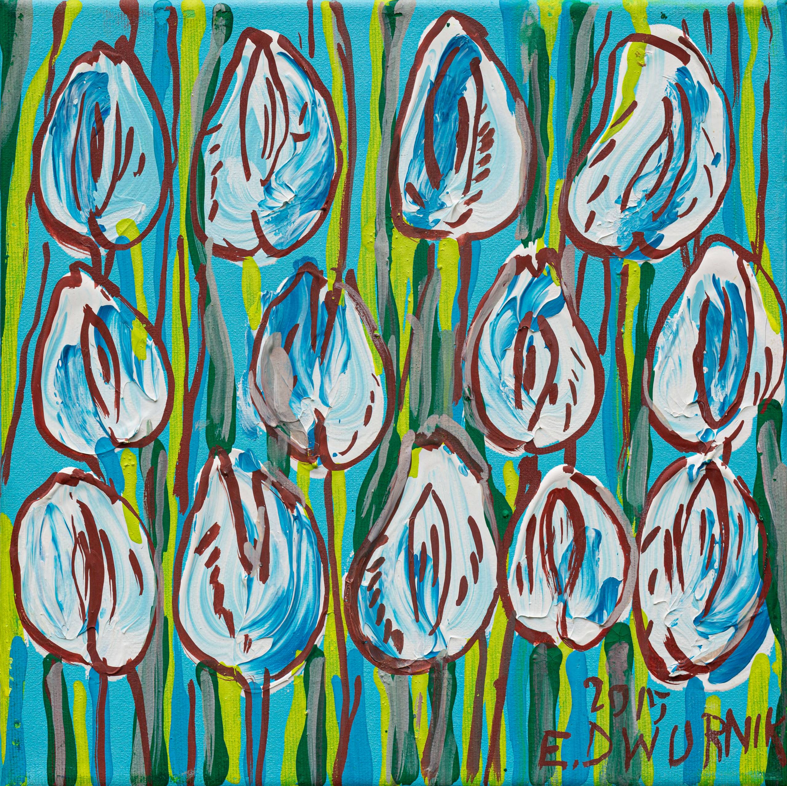 Obraz przyciąga wzrok eksplozją żywych kolorów. Na pierwszy rzut oka dominują błękitne i zielone barwy, które tworzą tło dla białych, radosnych kształtów przypominających pąki kwiatów. Kompozycja jest dynamiczna i pełna energii, jakby artysta próbował zamknąć w kadrze wiosenną symfonię kolorów. Wyraziste kontury podkreślone są ciemniejszymi liniami, które dodają głębi całości. Atmosfera jest beztroska i pełna świeżości, przypomina dziecięcą radość odkrywania nowego świata. Obraz emanuje spontanicznością i delikatnym chaosem. Można poczuć wibrujący nastrój prawdziwej artystycznej zabawy. Technika przypomina stylistykę ekspresjonizmu, gdzie energia i emocje dominują nad precyzyjnym odwzorowaniem rzeczywistości. Co za kolory! Paleta jest vibrant, czując niemal zapach wiosennych kwiatów. Patrząc na niego, przypomina mi się beztroska z dzieciństwa, kiedy wszystko wydawało się możliwe i kolorowe. To jakby patrzeć przez różowe okulary. Jak powiedziałoby dziecko: "Te kwiatki są jak z bajki!". Obraz pobudza wyobraźnię, skłaniając do refleksji nad pięknem i prostotą natury.