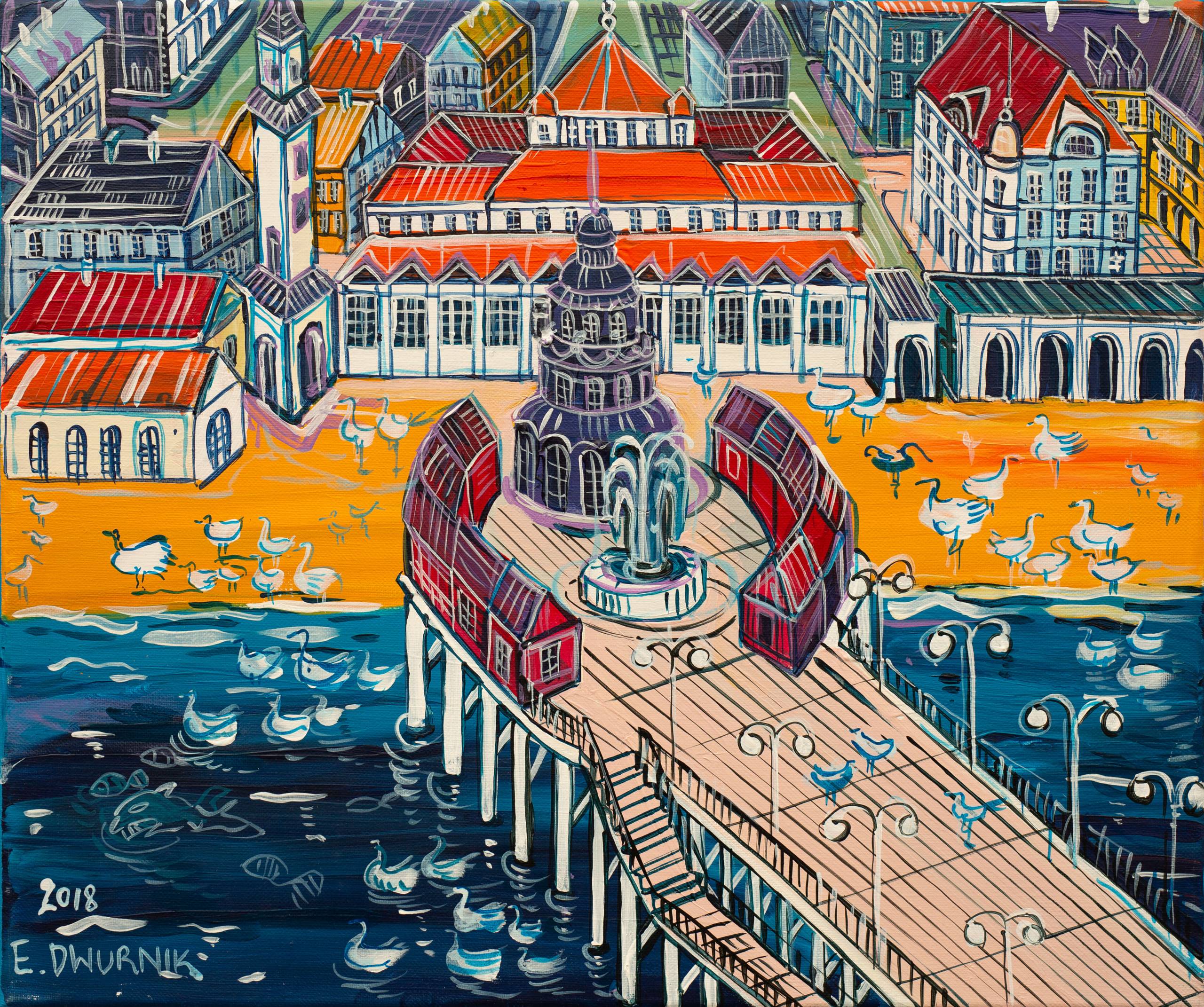 "SOPOT", rok 2018, olej i akryl na płótnie, format 46x55 cm Do obrazu dołączony jest certyfikat z Fundacji Edwarda Dwurnika potwierdzający że jest to ostatni obraz z miastem SOPOTEM z trwającego ponad 40 lat cyklu "Podróże Autostopem".