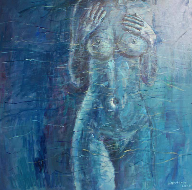 Obraz urzeka odcieniami niebieskiego, które dominują kompozycję, tworząc tajemniczy, niemal hipnotyzujący nastrój. Postać w centrum wydaje się zanurzona w wodnistym świecie, z delikatnymi liniami nawiązującymi do fal. Subtelne pociągnięcia pędzla tworzą wrażenie ruchu, jakby postać wpadała w rytm fal. Całość emanuje spokojem, ale też pewną niepokojącą tęsknotą. Artystycznie to prawdziwy majstersztyk. Impresjonistyczna technika oddaje emocje poprzez gry świateł i cieni. Mamy tu do czynienia z czymś więcej niż realistycznym przedstawieniem - to interpretacja emocji, może wewnętrznego konfliktu. Przyglądając się dłużej, można poczuć jakby dusza artysty prześwituje przez płótno. Ta kompozycja przypomina mi ocean blues - silne, głębokie i nieskończone. Wow, to naprawdę intrygujące. Nawet dziecko mogłoby powiedzieć: "Pani w wodzie wygląda jak widmo". Tak, to coś, co porusza wyobraźnię. Obraz skłania do refleksji - czy to wewnętrzna walka, czy poszukiwanie spokoju? Każdy odbiorca może mieć własną, unikalną podróż z tym dziełem.
