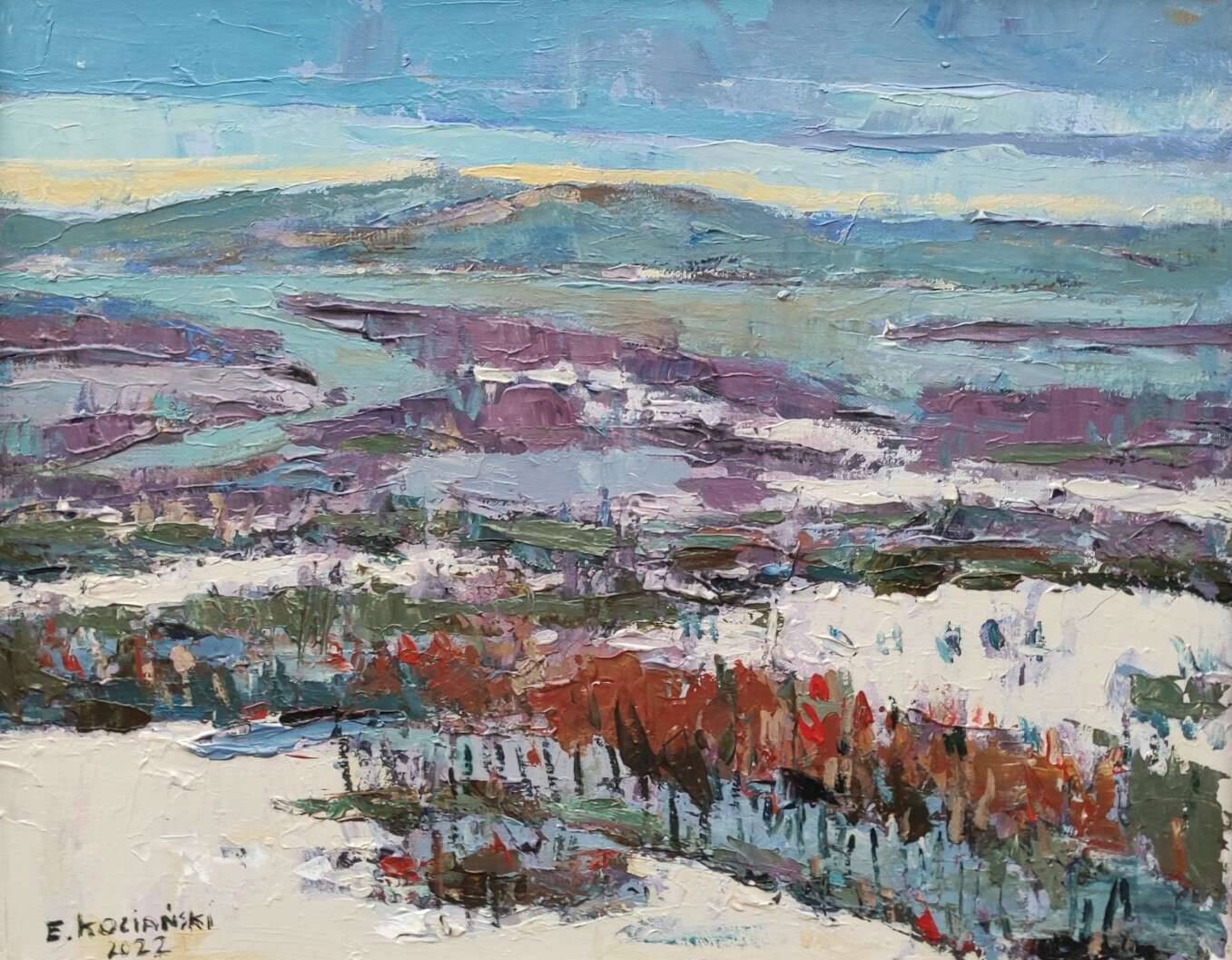 Na obrazie dominują pastelowe barwy, które tworzą dynamiczną kompozycję przypominającą zimowy krajobraz. Bezmiar błękitnego nieba styka się z odcieniami fioletu i zieleni, przechodząc w biel przypominającą śnieg. Pociągnięcia pędzla są wyraziste, ukazując impresjonistyczny styl artysty, zachwycają prostotą i jednocześnie głębią. Patrząc, można poczuć ciszę zimowego poranka, jakby czas na chwilę się zatrzymał. Niby nic wielkiego, ale trudno oderwać wzrok. Artysta używa gęstych, niemal trójwymiarowych warstw farby, które tworzą efektowne faktury. Technika impasto nadaje obrazowi żywiołowość i ruch. Trudno przekonać się do innego zdania – to po prostu piękne. Można niemal poczuć chłód powietrza przeszywającego widnokrąg. Między warstwami farby kryją się emocje w prostym, ale skutecznym wyrazie. Aż chce się tam być, bawić na śniegu jak dziecko. Dla mnie ten obraz jest jak zimowe "wonderland". Wzbudza uczucie spokoju i refleksji, zapraszając do chwili zadumy. Mimo swojej oszczędnej palety barw, tętni życiem. Może być symboliczną podróżą w głąb siebie, wyrazem tęsknoty za harmonią i naturalnym pięknem świata.