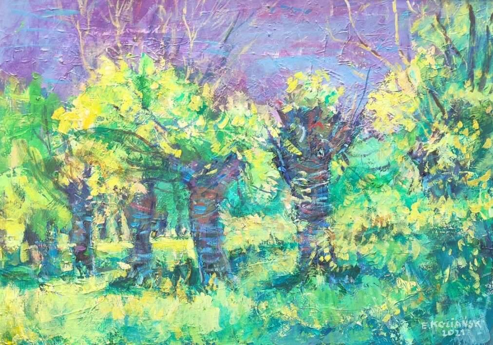 Na obrazie dominują żywe kolory, zwłaszcza zielone i żółte, które niemalże wibrują na tle fioletowego nieba. Kształty drzew są rozmyte, co nadaje kompozycji dynamicznego wyrazu, jakby las tańczył w rytm wiatru! Artysta zastosował technikę impasto, nadając powierzchni obrazu fakturę i głębię. Ślady pędzla są wyraźne, dodając spontaniczności i ekspresji. Obraz emanuje spokojem, ale i pewną tajemniczością, zapraszając do zanurzenia się w tej magicznej scenerii. To jakby być w magicznej krainie! Dzieło może budzić różnorodne emocje. Od spokoju i harmonii po nostalgiczną tęsknotę za utraconym rajem. Styl artystyczny przypomina impresjonizm, z naciskiem na uchwycenie chwilowego wrażenia i gry światła. Dla mnie osobiście, ten obraz to idealny "escape" od codziennego zgiełku! A może to tam, gdzie mieszkają elfy? Tak mogłoby powiedzieć dziecko patrząc na tę bajkową scenę. Łatwo tu zauważyć kontrasty i bogactwo kolorów, które sprawiają, że to miejsce wydaje się niemal nierealne. Wow, to naprawdę jest coś niezwykłego w swoim dreamy wydaniu.