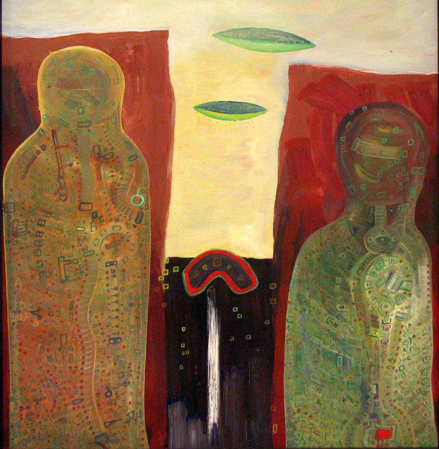Na tym obrazie dominuje ciepła paleta barw, z przewagą ceglastej czerwieni i miękkiej zieleni, które tworzą kontrast z jasnym, niemal białym tłem. Dwa postacie w centrum, przypominające abstrakcyjne sylwetki, są pełne drobnych geometrycznych wzorów, jakby ktoś wymyślił niezwykłą mapę miasta. Obraz emanuje spokojem, ale też tajemniczością. Czy jesteśmy w środku jakiejś opowieści? Może w dream world, gdzie wszystko jest możliwe i nic nie jest oczywiste. Styl to hybryda surrealizmu i malarstwo abstrakcyjnego, pełna odważnych eksperymentów z formą i kolorem. Obraz zachęca do myślenia i gdy na niego patrzę, czuję jakbym wchodził w inny wymiar. Czy te postacie rozmawiają? Może prowadzą dialog bez słów? Widoczne na górze elementy przypominają latające talerze, co dodaje obrazu odrealnionego klimatu. Jak mój pies biega rano po łące! Obraz daje poczucie odkrywania czegoś nowego przy każdym spojrzeniu.