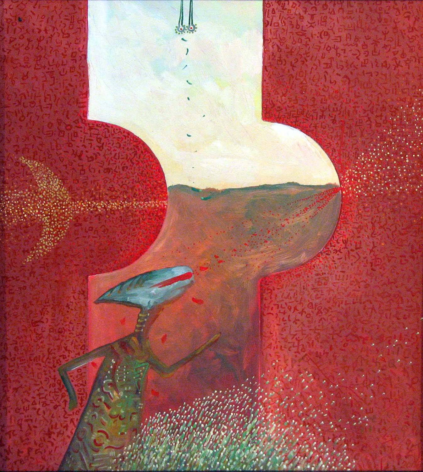 Obraz jest jak zagadka, pełen tajemnic i dziwności. Dominuje czerwień, intensywna i przyciągająca wzrok jak magnes. Ostra linia podziału tworzy formy, które przypominają nieregularne puzzle, które ktoś próbował złożyć na siłę. W centrum widzimy istotę – dziwną, kosmiczną, wywołującą uczucie niepokoju i fascynacji jednocześnie. Ma ona wydłużony kształt i twarz, jakby wyciętą z innego świata. Może to kosmita? W rogach obrazu widoczne są symbole, niczym tajemnicze runy lub zapomniana mowa antycznych cywilizacji. Obraz wydaje się mówić do nas językiem abstrakcji, może nawet surrealizmu. Styl artysty jest pełen sprzeczności – precyzyjny i chaotyczny zarazem. Czujesz się jak odkrywca, który stawia pierwsze kroki na nieznanej planecie. Emocje, które budzi, są równie złożone jak sam obraz. Trochę strach, trochę ciekawość – mieszanka, która potrafi zaintrygować na długo. Patrząc na niego, myślę: "Wow, that's deep". To jakby próbować złapać sen, który ulatuje w momencie przebudzenia. A mały chłopiec mógłby powiedzieć: "To chyba obraz z innej planety".