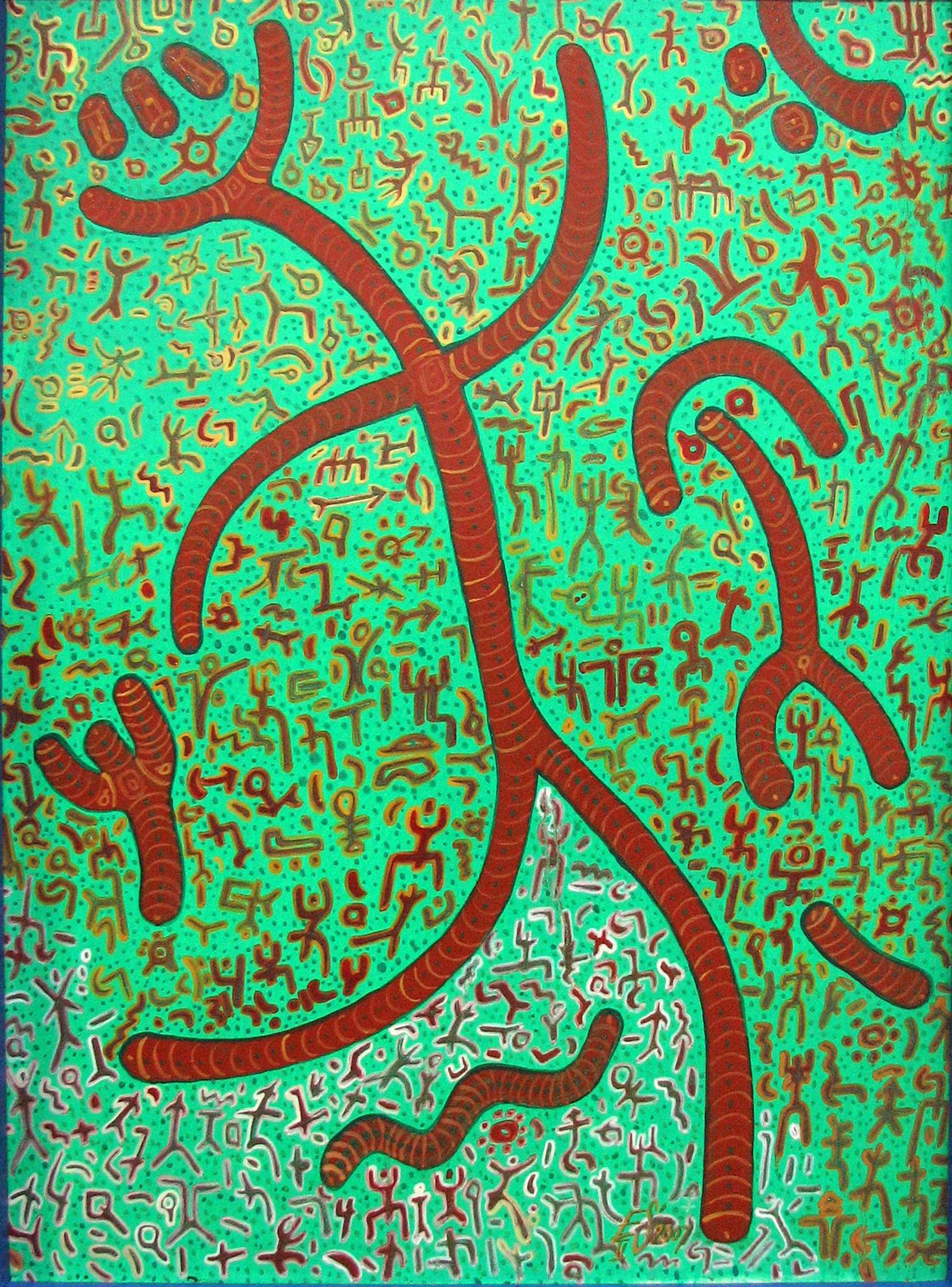 Obraz pełen jest jasnych kolorów i dynamicznych kształtów. Dominujący turkus, w połączeniu z rdzawymi odcieniami, tworzy kontrast, który przyciąga oko. Na pierwszy plan wysuwają się postaci przypominające rysunki naskalne, z wyrazistymi, falistymi liniami, które wygląda jak tańcujący człowieczki. Całość tworzy żywą i tętniącą energią kompozycję. Atmosfera jest zarazem surrealistyczna i pierwotna, jakby przeniesiona z pradawnych epok do świata współczesnego. Artysta zastosował technikę przypominającą prymitywne malowidła, choć jest to tylko iluzja, Fresk pełen jest detali, jak małe pociągnięcia pędzla, które dodają teksturę. Jego styl to połączenie naiwności z przemyślanym chaosem. Wzbudza wiele emocji - od zdumienia, przez zaciekawienie, po fascynację. Patrząc na to, można odnieść wrażenie, że każda linia opowiada historię, każda postać skocze z radości. Obraz ten może wzbudzać uśmiech, niczym dziecięcy wierszyk "Look, I'm dancing!”. Każdy, kto spojrzy, poczuje nutkę zabawy — jakby zanurzył się w grze, w której wszystko jest możliwe. Czy to dzieło jest metaforą życia pełnego niespodzianek? Być może. A może zwykłą próbą uchwycenia radości tworzenia? Cóż, to już musi każdy zadecydować sam.