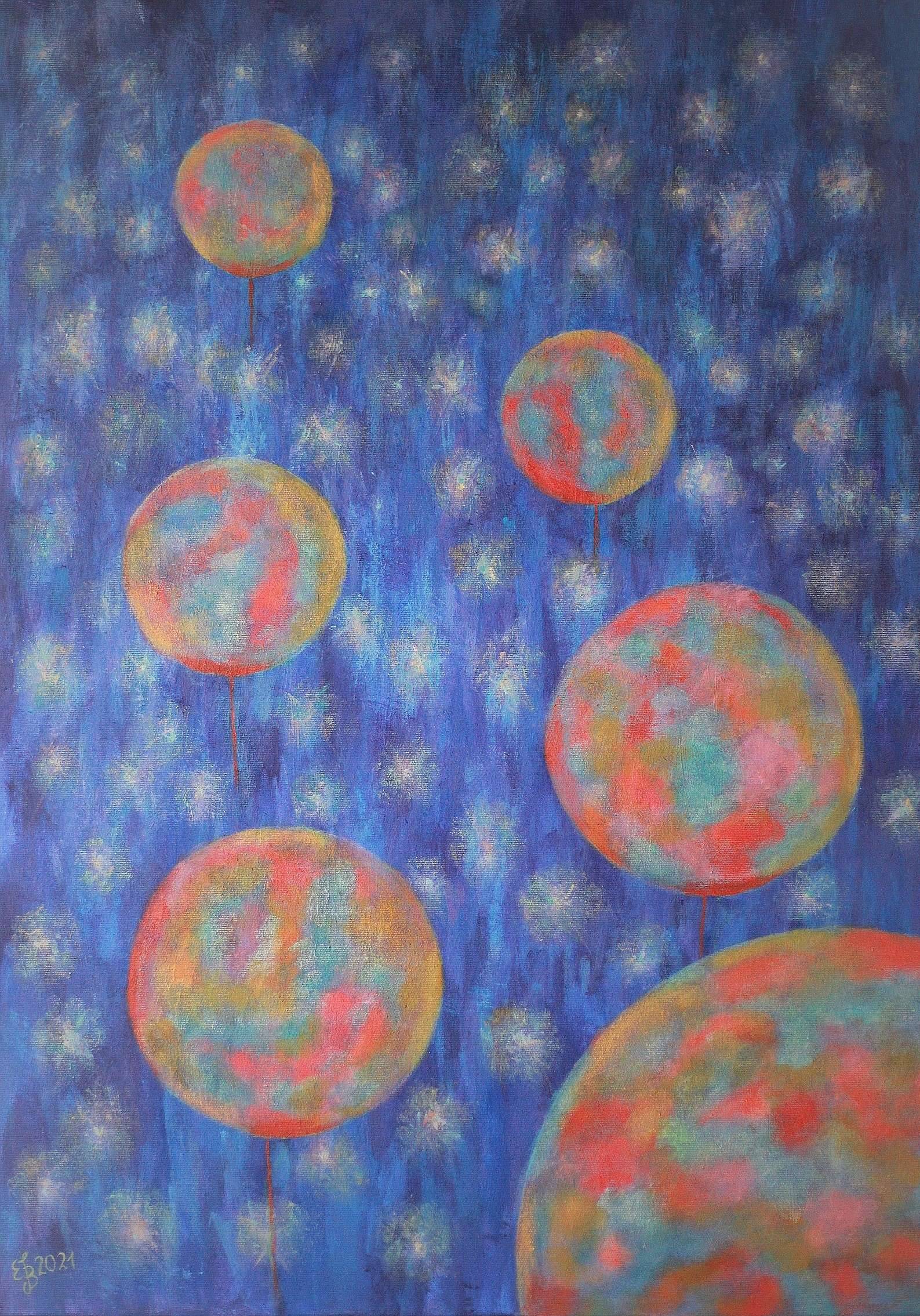 Marzenia nie mogą być trzymane na uwięzi, bo wtedy tracą swoją naturę i moc, dlatego muszą unosić się ponad to, co zwyczajne i codzienne. Wypuszczone są w stanie sięgać gwiazd, szybować i bujać w przestworzach. W tym tkwi ich piękno, kształt i niedookreśloność Kolory i ich odcienie to już interpretacja, którą pozostawiam odbiorcom. Obraz ma zamalowane boki i jest zawerniksowany, gotowy do zawieszenia, doskonały do sypialni.