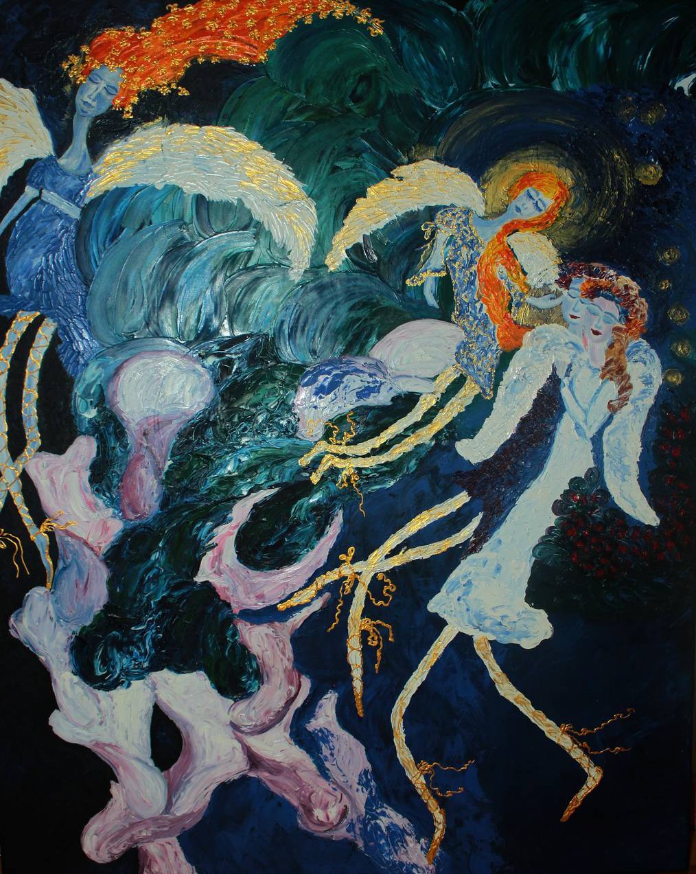 Obraz tętni życiem i pełen jest kolorowych kontrastów, przyciągając wzrok swą dynamiczną kompozycją. Dominuje tutaj mieszanka głębokich zieleni i intensywnych błękitów, które zdają się falować i wirują w tańcu z wyraźnymi fragmentami pomarańczu i złota. Kształty postaci są wydłużone i płynne, niemal surrealistyczne, co nadaje całości lekkości i delikatności. Atmosfera obrazu jest baśniowa, niemal magiczna, jakbyśmy zajrzeli w świat po drugiej stronie lustra. Artysta wykorzystał technikę impastu, co dodaje faktury i głębi, kreując efekt trójwymiarowości. Pociągnięcia pędzla są widoczne, jakby to były ślady po czymś, co poruszało się z impetusem, energetycznie. Wow, te aniołki są naprawdę cool! Elementy złote działają jak światło w ciemności, prowadząc wzrok po zakamarkach kompozycji. Emocje, jakie budzi obraz, to mieszanina zachwytu, niepokoju i zaciekawienia. Jest w tym coś nostalgicznego, co przypomina o dziecięcych marzeniach i snach. Obraz może interpretować jako odzwierciedlenie wewnętrznej walki światła z ciemnością, chaosu z harmonią. Z jednej strony jest bajkowy, z drugiej potrafi wzbudzać refleksje nad dualnością ludzkiej natury. Takie uczucia i przemyślenia unoszą się w powietrzu niczym zapach świeżo skoszonej trawy w upalny dzień.