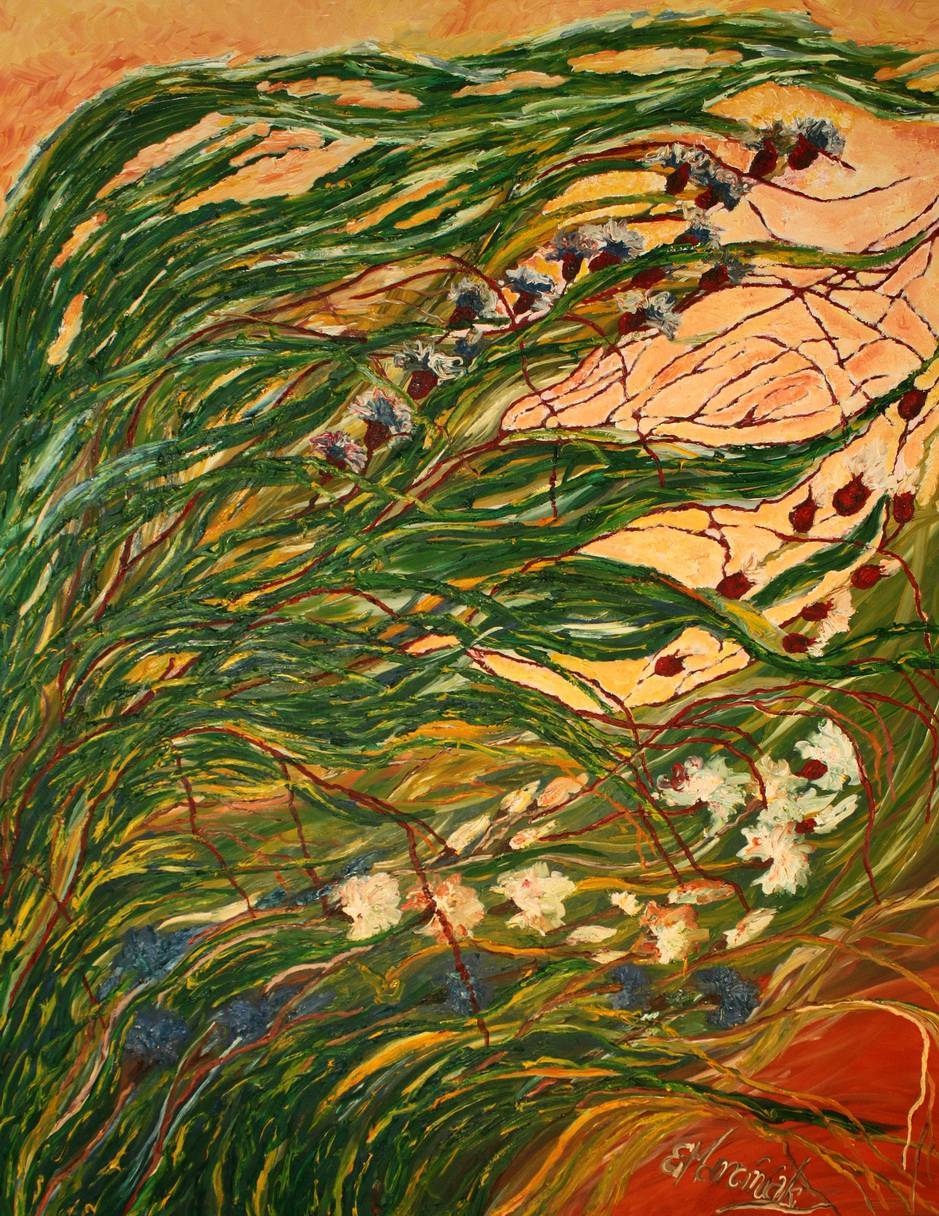 Obraz emanuje energią i dynamiką. Dominują na nim odcienie zieleni, przeplatające się z ciepłymi tonami pomarańczy i czerwieni. Kształty są falujące, jakby widziane przez pryzmat ruchu wiatru, który bawi się roślinnością. Kompozycja przypomina taniec liści na wietrze, z dodatkiem śmiałych, czerwonych akcentów niczym nuty wiosennej muzyki. Atmosfera płótna jest żywa, pełna ruchu i lekkości. Przypomina letni poranek, kiedy słońce leniwie wstaje nad horyzontem. Można poczuć delikatną bryzę i usłyszeć śpiew ptaków. Styl artystyczny jest swobodny, niemal impresjonistyczny, z widocznymi pociągnięciami pędzla, co nadaje obrazowi teksturę. Obraz wzbudza emocje radosci i wolności. To idealne przypomnienie piękna przyrody. "Wow, ten obraz jest super!" mogłoby powiedzieć dziecko, zachwycone kolorowym spektaklem. Paleta barw i spontaniczność formy mogą przywołać wspomnienia letnich spacerów. To art is so cool, bo pozwala zapomnieć o codziennych troskach. Myśli ulatują daleko, pozwalając na chwilę zatracić się w artystycznym świecie pełnym optymizmu.