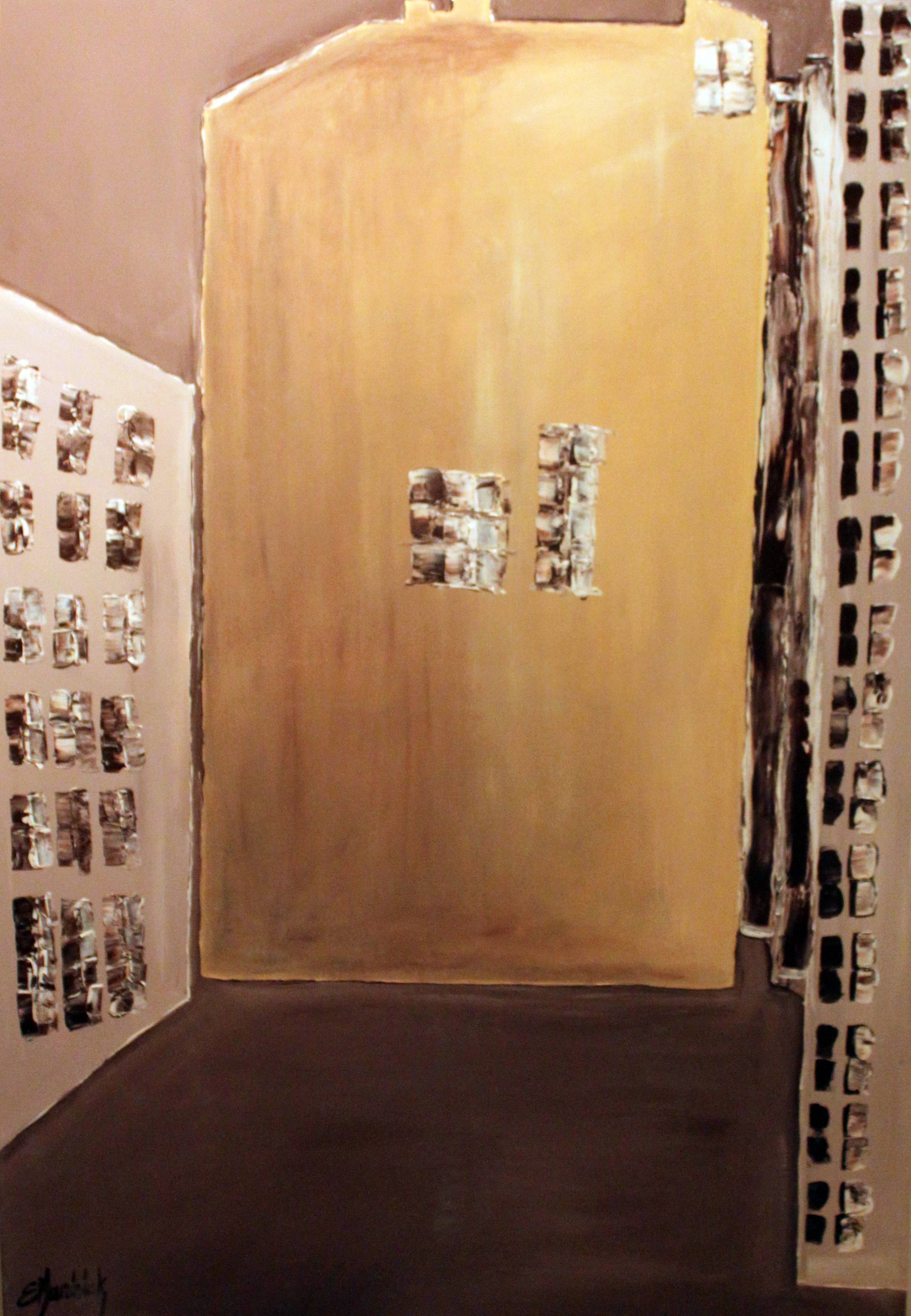 Na obrazie widnieje abstrakcyjna kompozycja, która bawi się prostotą kształtów i subtelnością kolorów. Dominują tu odcienie brązu, beżu i bieli, tworząc harmonijny, choć nieco surowy klimat. Centralnym punktem jest duży prostokąt w odcieniu złotego beżu, otoczony mniejszymi formami przypominającymi okna wieżowców. Artysta użył techniki impasto; widoczne są ślady pędzli, które dodają tekstury i głębi. Atmosfera obrazu jest spokojna, ale lekko tajemnicza. Przywodzi na myśl pusty miejski krajobraz, w który można się zatopić. A może to jakaś cicha scena z codzienności miasta? Możliwości są endless. Obraz może wywoływać u odbiorcy uczucie nostalgii i zamyślenia nad melancholią miejskiego życia. To coś jakby minimalistyczny obraz modernistyczny, gdzie każdy, nawet najmniejszy detal ma znaczenie. Szczypta surrealizmu -- nieoczywista gra świateł i cieni dodaje głębi. Moje pierwsze skojarzenie? Mały świat ukryty gdzieś w betonowej dżungli. Jak ciacho, na które zawsze czekamy w weekend. Jest tu coś niezwykle autentycznego i czystego, co sprawia, że obraz trafia prosto do serca.