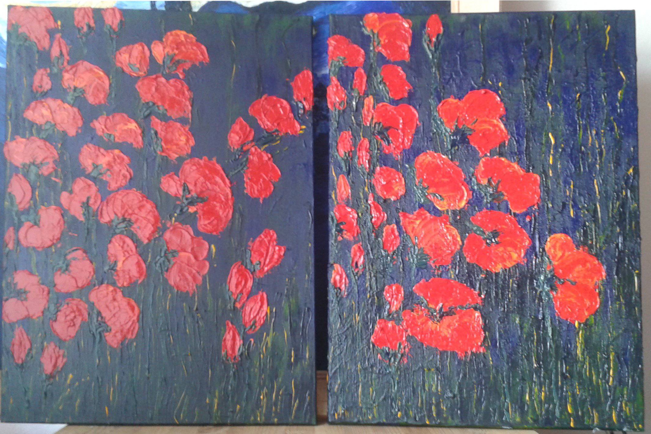Na obrazie widzimy intensywnie czerwone maki, które niemal wyskakują z ciemnoniebieskiego tła. Ich płatki malowane są grubą warstwą farby, co nadaje dziełu teksturę prawie dotykalną. Kontrast między żywymi czerwieniami a głębokim błękitem tła dodaje dramatyzmu i przyciąga wzrok. Obraz emanuje jednocześnie spokojem i energią, jakby maki tańczyły na wietrze w ciepły letni dzień. Styl artystyczny przypomina nieco impresjonizm, z mocnym naciskiem na kolory i ich interakcje. Farba nakładana szerokimi pociągnięciami pędzla stwarza wrażenie ruchu, niemalże jak w animacji. Czuć, że artysta bawił się teksturą, tworząc dynamiczny, ale zarazem harmonijny efekt. Obraz może wywoływać w odbiorcy poczucie nostalgii, przypominając o beztroskich chwilach spędzonych na łonie natury. A może pojawia się myśl o przemijaniu, gdzie każdy kwiat to jeden fleeting moment w czasie. Wow, jak to malowidło chwyta za serce! Dla dziecka to pole czerwonych, jak serduszka, kwiatków, które byłyby idealne dla króliczka-skrzata. Autor zastosował technikę impasto, podkreślając fakturę i żywotność dzieła. Obraz zachęca do osobistej refleksji i przywodzi na myśl nieustanną obecność piękna w codziennym życiu.