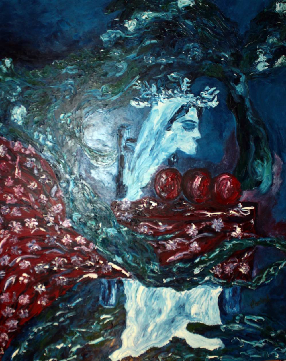 Ten obraz emanuje tajemniczą aurą, pełną zawirowań kolorów i kształtów, które przeplatają się niczym senne mary. Dominują ciemne odcienie niebieskiego, zielonego i czerwonego, które tworzą dramatyczny kontrast, dodając dziełu głębi. Kompozycja jest dynamiczna, z falującymi liniami sugerującymi ruch i nieustanny przepływ energii. W centrum uwagę przykuwa kobieca twarz, z delikatnym profilem wyłaniająca się z niemal eterycznego, niebieskiego światła. Wrażenie chaosu przeplata się z harmonią, tworząc atmosferę, która jest zarazem intensywna, jak i pełna spokoju. Styl artysty przypomina impresjonizm, choć jest bardziej abstrakcyjny, skłaniając widza do zatrzymania się na chwilę i zastanowienia. Technika nakładania farby jest śmiała, z widocznymi pociągnięciami pędzla, które dodać mogą obrazu tekstury i wymiaru. Przyglądając się dziełu, można poczuć pewien niepokój, może nawet fascynację. Co tu się dzieje? Może to obraz snu, wizji? Trzy czerwone kule wydają się symboliczne, przywodząc na myśl pytania o ich znaczenie, czy to może są jabłka? Myśli dryfują, próbując zrozumieć ukryte przesłanie. A gdyby 7-latek to opisał, mógłby powiedzieć: "To wygląda jak magiczny las w nocy!". A magic, that's the word, klucz do tego, co czyni ten obraz tak intrygującym i pełnym emocji.