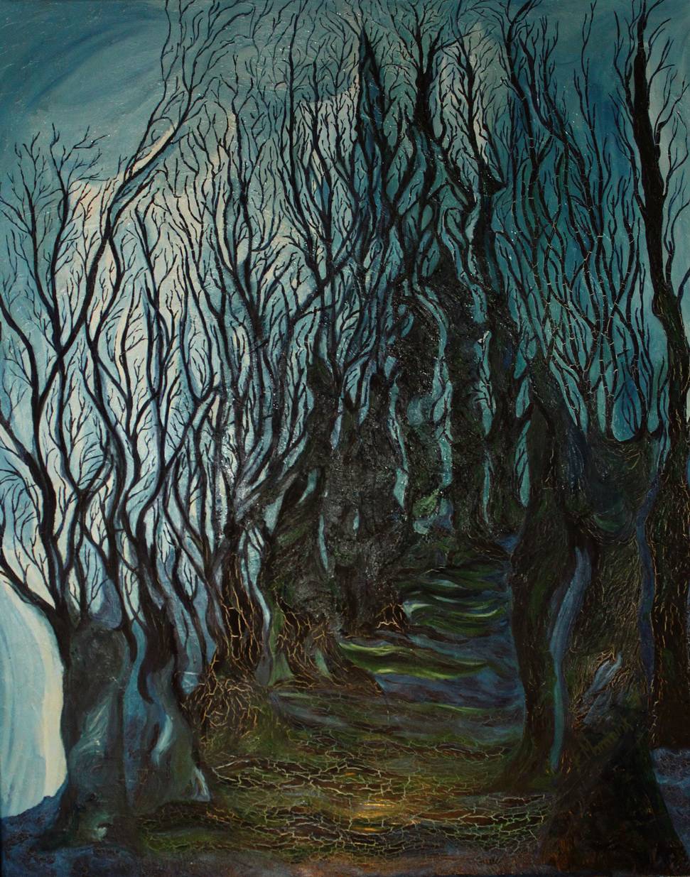 Na obrazie dominuje mroczny las z nagimi, poskręcanymi gałęziami, które majestatycznie sięgają ku bladoniebieskiemu niebu. Drzewa tworzą gęsty, niemal labiryntowy tunel, otulony delikatnym, tajemniczym światłem przypominającym wczesny zmierzch. Zieleń trawy pod drzewami odcina się od ciemnych pni, przyciągając wzrok niczym secret path, który próbuje rozbudzić ciekawość. Nastrój dzieła wiruje między tajemnicą a niepokojem, niczym bajka, którą opowiada się przy ognisku. Artysta zastosował dynamiczne pociągnięcia pędzla, podkreślające ruch i chaos natury. Klimat malowidła jest surowy i zimny, a jednocześnie fascynujący. Czujesz się jak w środku snu, gdzie każde drzewo mogłoby nagle ożyć i powiedzieć swoją historię. Patrząc na obraz, można poczuć delikatny dreszczyk emocji. Coś jak odkrywanie nowego, tajemniczego miejsca, które jednocześnie przyciąga i odpędza swoją aurą. Las wydaje się być pochłonięty ciszą, która krzyczy o zagubionych opowieściach. Kto tam kiedyś chodził? Może kot zawsze schowa się w cieniu drzew – myśli siedmiolatka. Magiczne, prawda? Kaloryczna paleta barw mieni się subtelnie, dodając głębokości i dramatyzmu. Dzieło emanuje esencją czegoś pierwotnego i nieokiełznanego. Jest coś hipnotyzującego w jego chaosie i harmonii, co sprawia, że chce się w nim zgubić, choć na chwilę.