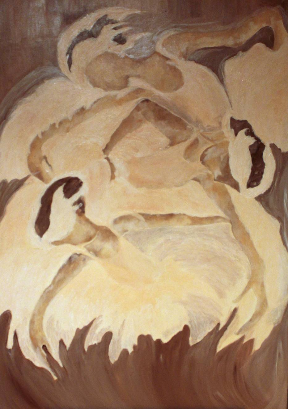 Na obrazie dominują ciepłe odcienie beżu i brązu, które tworzą zawiłe kształty, przypominające falujące linie i abstrakcyjne formy. Kompozycja jest dynamiczna i nieco tajemnicza. Kolory płynnie przechodzą jeden w drugi, co dodaje pracy organicznego charakteru. Atmosfera spokoju i skupienia miesza się z lekką nutą tajemnicy. To uczucie, jakby obraz coś ukrywał. Styl artystyczny, który zastosował twórca, to prawdopodobnie forma abstrakcjonizmu. Brak tu wyraźnych konturów, a technika gry światłem i cieniem buduje delikatne przejścia między poszczególnymi elementami. Aż chce się zadać pytanie: co artysta miał na myśli? Każdy może zobaczyć coś innego. Może to być taniec dwóch postaci, a może wirująca energia. Obraz może wywoływać różne emocje - dla jednych będzie to uczucie spokoju i wyciszenia, dla innych intrygujące zamyślenie. Co czuję patrząc na to dzieło? Hmm, może to nostalgia za czymś nieokreślonym. Dla mnie, to jak marzenie senne. "Wygląda jak piana z mydła!" - powiedziało dziecko. To what's the magic in this painting? Wyjątkowa umiejętność uchwycenia ruchu w bezruchu. To, co wydaje się chaotyczne, ma swoją harmonię. Pozwala widzowi na chwilę refleksji, a jednocześnie pozostawia miejsce na osobiste interpretacje.