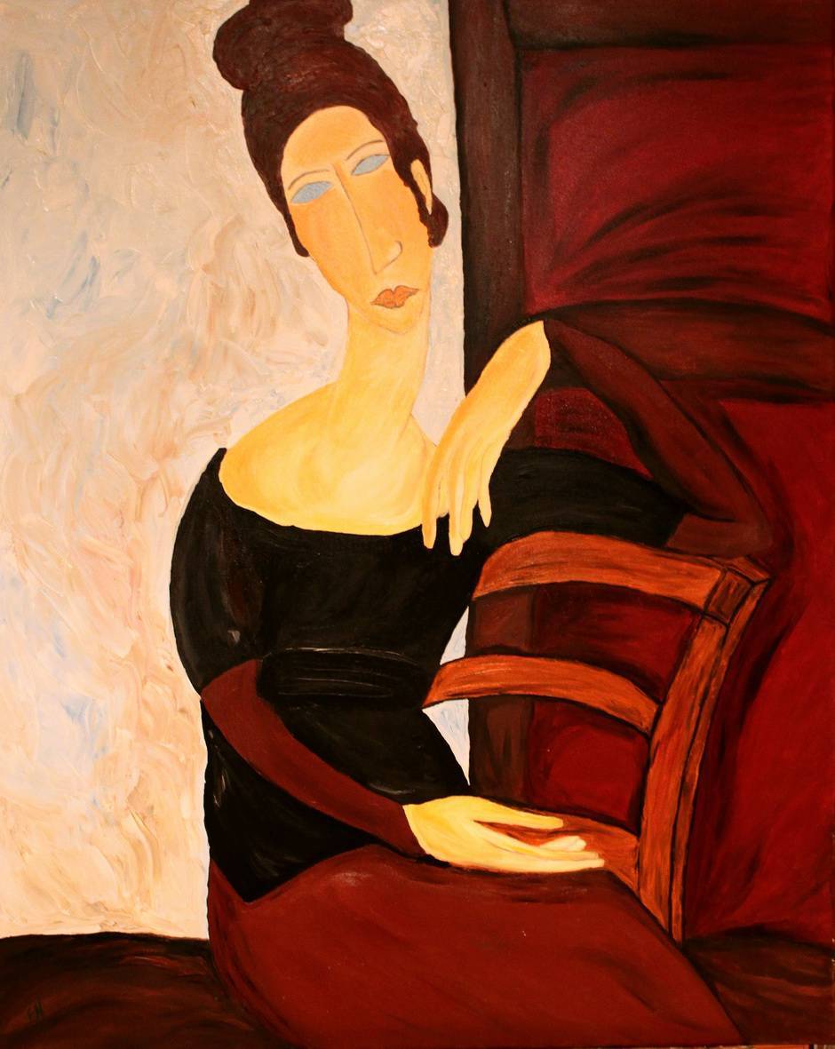Na obrazie widzimy enigmatyczną postać kobiety z subtelnym, delikatnym uśmiechem. Dominują ciepłe odcienie brązu i bordowego, które dodają scenie intymnego, niemal melancholijnego charakteru. Suknia w głębokim czerni kontrastuje z jasnym tłem, tworząc wrażenie tajemniczości. Kształty są zgeometryzowane, co nadaje całości nieco surrealistycznego stylu. Postać jest jakby zamyślona, jej nienaturalnie wydłużona szyja oraz migdałowe oczy zdają się przenikać widza na wskroś. Atmosfera obrazu jest pełna spokoju, ale też pewnego napięcia – jakby coś ukrywało się za fasadą spokoju. Styl artystyczny przywodzi na myśl szkołę ekspresjonizmu z dalekimi wpływami fowizmu. Użyta technika malarska pozwala uwypuklić emocjonalność dzieła. Sugestywne pociągnięcia pędzla, miejscami impastowe, dodają tekstury i głębi. Obraz może wywoływać u odbiorcy uczucie nostalgii, jakby chciał opowiedzieć historię kogoś bliskiego. „To wygląda jak portret królowej”, powiedziałby dzieciak, patrząc na tę elegancką postać. Zadziwiające, jak artysta ukazuje emocje poprzez prostotę formy. Sometimes, simplicity is the ultimate sophistication, jak powiedzieliby po angielsku. Oglądając ten obraz, można zatopić się w rozważaniach nad tajemnicą, którą niesie.