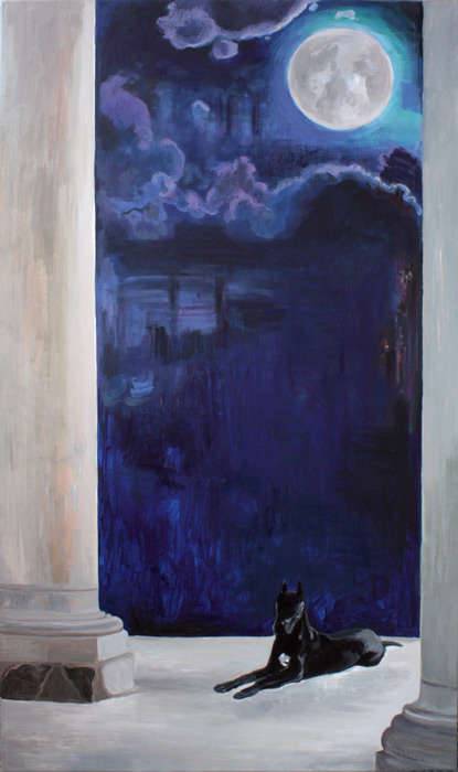 Ten obraz to esencja spokoju i tajemnicy. Dominują na nim chłodne odcienie niebieskiego i fioletu, które zdobią niebo pełne rozmytych chmur, z pełnym, jasnym księżycem unoszącym się majestatycznie. Kompozycja jest wyważona, z dwiema monumentalnymi kolumnami po bokach, które niczym strażnicy oddzielają ciemność nocy od bielonego dziedzińca. Na pierwszym planie leży czarny pies – jego sylwetka jest spokojna, niemal nieruchoma. Atmosfera wydaje się nieco nostalgiczna, ale też magiczna, jakby czas zatrzymał się w tym jednym momencie. Styl artysty łączy realistyczne elementy z onirycznym klimatem. Techniki malarskie zdają się być precyzyjnie zaplanowane, ale z nutą swobody, co dodaje obrazu głębi. To połączenie skutkuje wrażeniem, że jesteśmy świadkami czegoś niezwykle pięknego i niesamowicie intymnego, almost surreal. Dla dziecka to mogło by być miejsce, gdzie zaczynają się przygody, a księżyc pilnuje nocy. Wśród emocji, które budzi obraz, można poczuć nutkę melancholii i kontemplacji, może nawet zaciekawienie – co kryje się poza ciemnością? Pojawia się refleksja, jakby zwyczajne połączenie architektury z naturą otwierało drzwi do marzeń. Kto wie, może ten pies to strażnik naszych tajemnych myśli, kronikarz nocnych opowieści? Patrząc na to dzieło, możemy na chwilę uciec od rzeczywistości, zatrzymać się w magicznym świecie wyobraźni – coś fascynującego w tym tkwi, prawda?