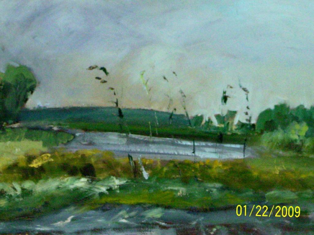 Ten obraz to prawdziwa eksplozja zieleni i odcieni szarości, które tworzą spokojną, choć nieco nostalgiczna atmosferę. Krajobraz rozciąga się po horyzont, gdzie niebo styka się z linią ziemi. Kolory są stonowane, jakby artysta celowo unikał jaskrawych barw, by podkreślić subtelność i naturę chwili uchwyconej na płótnie. W tle widać niewyraźne zarysy drzew, które nadają kompozycji naturalności. To jak malowany sen, gdzie wszystko zdaje się poruszać leniwie na miękkim wietrze. Artysta użył techniki plam i rozmyć, by oddać delikatność pejzażu. Pociągnięcia pędzla są swobodne, niemalże chaotyczne, co nadaje pracy nieco impresjonistyczny charakter. Można się poczuć jak w "dreamland", gdzie rzeczywistość miesza się z fantazją. Ta swoboda pędzla rozwija wyobraźnię odbiorcy, pozwalając mu na własne interpretacje. Dzieło budzi różne emocje. Pewnie dziecko powiedziałoby: "Patrz, jak kolorowo!" I miałoby rację. Patrząc na obraz, można poczuć zarówno spokój, jak i lekki smutek. Może to tęsknota za przeszłością lub po prostu zachwyt nad pięknem chwil przemijających. Każdy z nas może zobaczyć tam coś innego; dla jednych będzie to tylko krajobraz, dla innych coś więcej – może nawet wspomnienie z dzieciństwa.