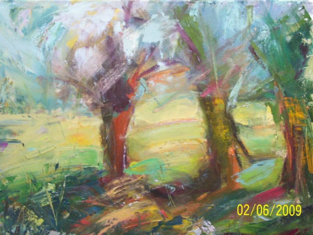 Na obrazie widać harmonijną plątaninę kolorów, które zdają się tańczyć w rytmie natury. Przewijają się zielienie, żółcie, fiolety i błękity, tworząc nasycone i dynamiczne tło. Kompozycja wydaje się nieco chaotyczna, ale właśnie to nadaje jej niezwykły urok. Czyż to nie przypomina spaceru po lesie w wietrzny dzień? Artysta wykorzystał techniki impasto, nakładając grube warstwy farby, co dodaje dziełu ciężaru i głębi przez co obraz wydaje się niemal dotykalny. Atmosfera obrazu działa hipnotyzująco. Jest zarazem ruchliwa i spokojna, jak letni poranek w parku, gdzie poranne słońce przebija się przez liście drzew. Feel free to imagine jak wiatr porusza gałęziami, a ty chłoniesz zapach świeżości. To chwila ulotna, uchwycona w wiecznym tańcu barw. Dzieło wywołuje różnorodne interpretacje. Dla jednych może być symbolem wolności, dla innych refleksją nad przemijaniem. Moja młodsza siostra powiedziałaby: "Patrz! Drzewa robią gimnastykę!" Obraz budzi w człowieku zarówno spokój jak i energię, a ja zastanawiam się, czy czasem sama natura nie chciałaby tak się malować.