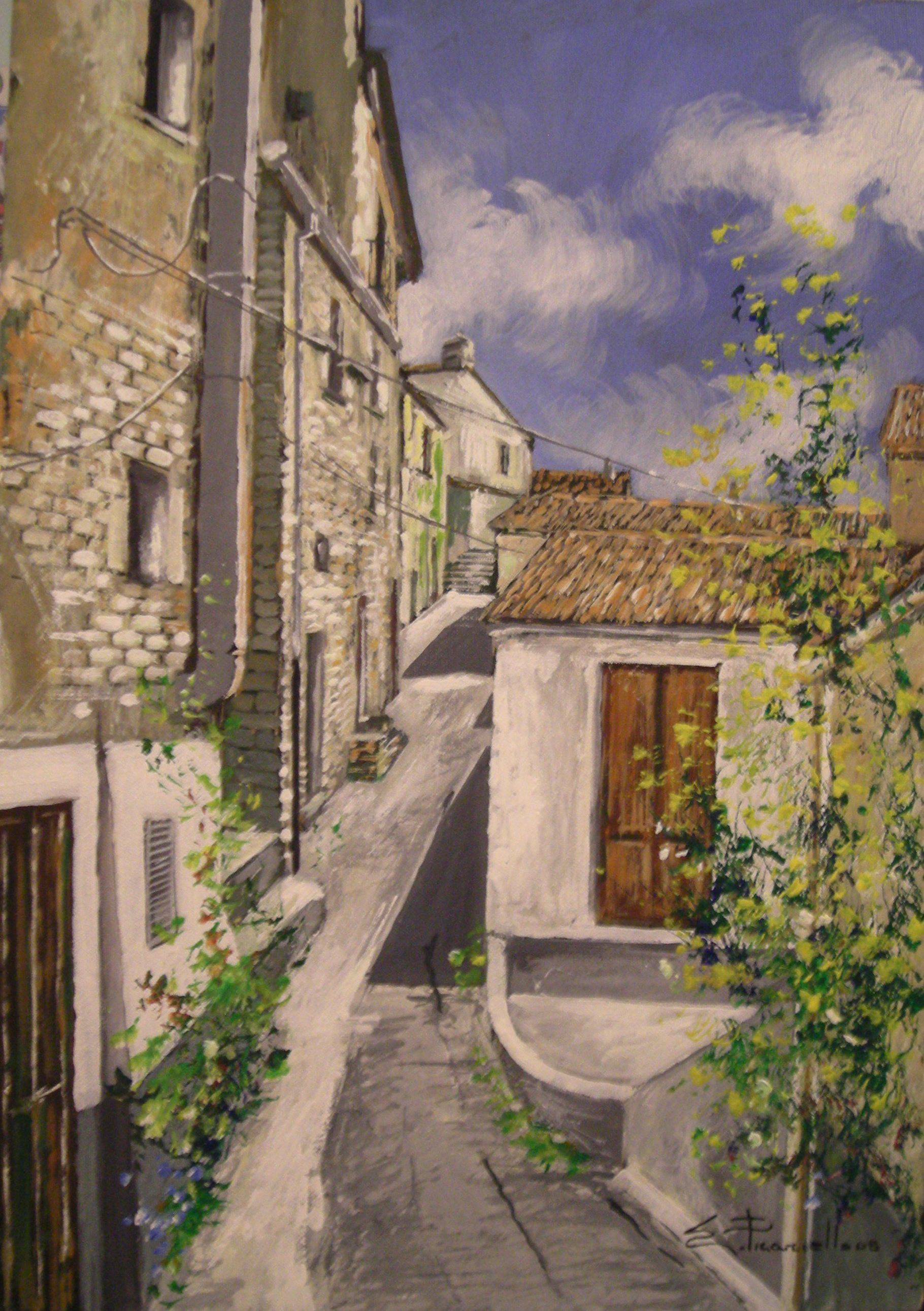 Obraz przedstawia malowniczą uliczkę w małym miasteczku, gdzie ściany pokryte są jasnymi, pastelowymi kolorami, a niebo zdobią puszyste chmury. Artysta użył ciepłych odcieni beżu i szarości, tworząc atmosferę spokojnego popołudnia. Kształty budynków są ostro zarysowane, co dodaje kompozycji wyrazistości. Czuć tu pewne "old-world charm". Ta malarska scena wywołuje we mnie tęsknotę za prostotą dnia codziennego. Podziwiając ten obraz można prawie usłyszeć szmer wiatru między murami i poczuć ciepło słońca na skórze. Styl jest realistyczny, ale z subtelnymi impresjonistycznymi akcentami, co daje dziełu głębię i ruch. Technika malarska sprawia wrażenie, jakby artysta lekko pociągał pędzlem, zostawiając ślady dynamiki i życia. "Tam bym chciał mieszkać!" pomyślało 7-letnie dziecko. Rysunek jest więc jak stopklatka czasu, moment uchwycony na wieczność. To miejsce, w którym chciałoby się zgubić na chwilę. Obraz przyciąga uwagę, jak magnes, do tej spokojnej uliczki wypełnionej historycznym urokiem.