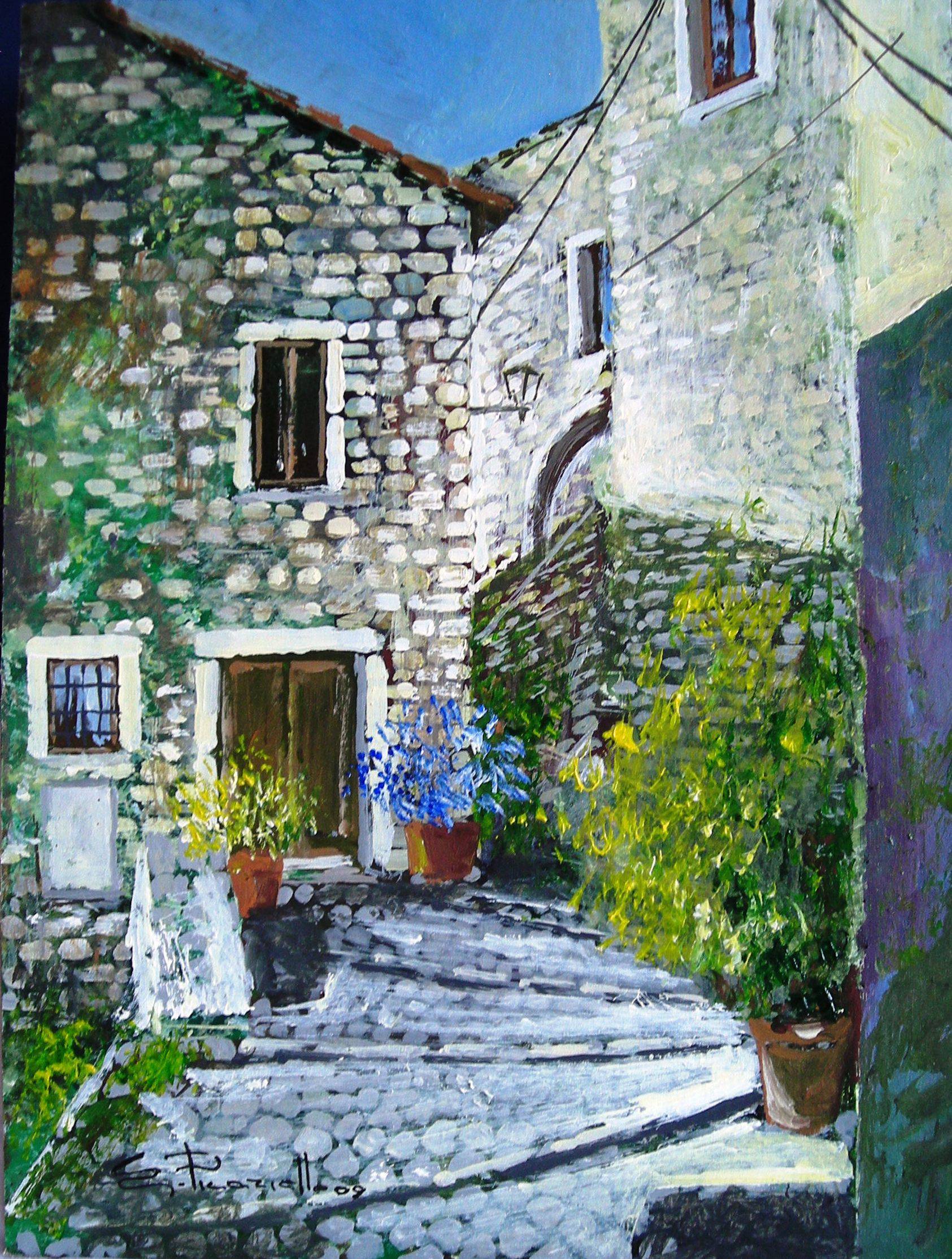 Obraz przedstawia urokliwy zakątek małego miasteczka. Dominują tu ciepłe odcienie beżu i zieleni, które idealnie współgrają z błękitem nieba. Kamienne ściany budynków, z widocznymi plamkami mchu i roślin, tworzą ciekawy kontrast. Kompozycja skupia się na spokojnej uliczce, prowadzącej do drewnianych drzwi, otoczonych przez barwne kwiaty w donicach. Hmm, jakoś aż czuć ten zapach lata. Nastrój obrazu jest idylliczny i przytulny, emanuje spokojem i ciepłem południa. Technika użyta przez artystę wskazuje na impresjonizm – widoczne pociągnięcia pędzla nadają lekkość i dynamikę. To trochę jakby patrzeć przez mgiełkę wspomnień. Widz może się poczuć jak turysta, który znalazł idealne miejsce na chwilę wytchnienia. Dzieło budzi pozytywne emocje, przypominając wakacyjne chwile. Elementy takie jak cień drzewa na bruku, dodają mistyki i nostalgii. To takie miejsce, gdzie chciałbym przysiąść na chwilę, złapać chwilę spokoju. Look at those vivid colors! Mój brat by pewnie powiedział: "Chodźmy tam na lody!" Ten obraz to prawdziwe zaproszenie do podróży marzeń.