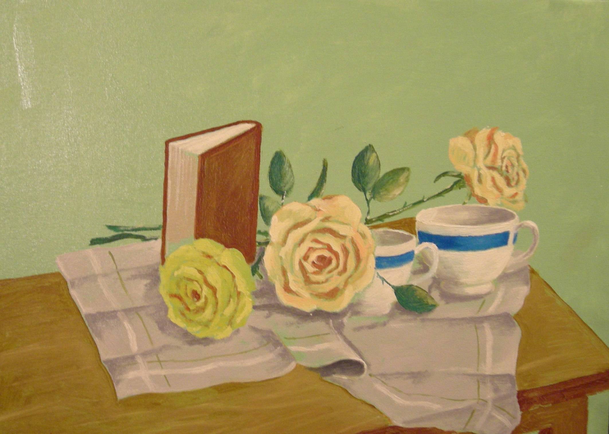 Obraz ukazuje spokojną i harmonijną martwą naturę, gdzie na drewnianym stole leży książka ubrana w brązową okładkę, a obok niej delikatnie ułożone róże o kremowych odcieniach. Między nimi przemykają zielone liście, dodając całości organicznej świeżości. Tło obrazu jest utrzymane w miękkim, pistacjowym odcieniu, który wprowadza klimat spokoju. Dwie filiżanki z niebieskim paskiem stoją na białym, lekko pogniecionym obrusie, tworząc kompozycję prostą, ale pełną uroku. Moje słowa pewnie nie oddadzą w pełni uroku i elegancji tego dzieła. Twórca obrazu zastosował technikę delikatnego cieniowania, co nadaje każdemu elementowi subtelnej trójwymiarowości. Wydaje się, jakby każda pociągnięcie pędzla było dobrze przemyślane, co dodaje obrazu klasyczny styl. Dzieło to emanuje atmosferą nostalgii, zapraszając do chwili refleksji. Patrząc na nie, można poczuć, jakby czas się zatrzymał. "Look, it's so pretty!" - mogłoby powiedzieć dziecko. Emocje, które mogą się pojawić w każdym odbiorcy, to mieszanka spokoju i ciepła, jakbyśmy siedzieli w zacisznym kąciku, czytając książkę i popijając herbatę. Wrażenie, jakie pozostawia ten obraz, to tęsknota za chwilą wytchnienia.