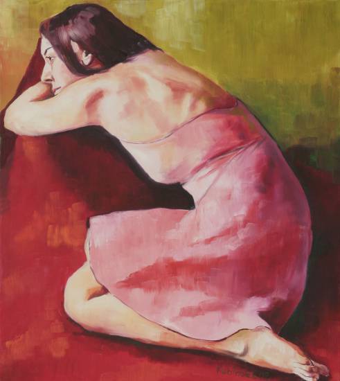 Obraz przedstawia kobietę siedzącą na podłodze w różowej sukience. Jej ramiona opierają się o coś miękkiego, może poduszkę, a ona wygląda jakby była zamyślona. Tło to ciekawe połączenie zieleni i rudości, które tworzy kontrast z delikatnymi odcieniami sukienki. Kolory są nasycone, a pociągnięcia pędzla wyraźne, co dodaje głębi i tekstury do całej sceny. Obraz emanuje spokojem, ale i lekką melancholią. Może to poranek, gdy myślę o przyszłości. Artysta używa realistycznego stylu, który przełamuje nutą impresjonizmu. Swobodne pociągnięcia pędzla potrafią wciągnąć, a do tego technika światłocienia jest mistrzowska. Tworzy to uczucie intymności, jakbyśmy zaglądali do jej prywatnego świata. Dzieło wywołuje refleksje, przywodząc na myśl momenty zadumy i odpoczynku. "Myślę, że ona jest smutna, ale ładna" – jak powiedziałoby dziecko. Patrząc na obraz, czuję spokój, a jednocześnie pewną tęsknotę. Moje myśli płyną, jak soft breeze ponad falami kolorów. To sztuka pełna zamyślenia i subtelności.