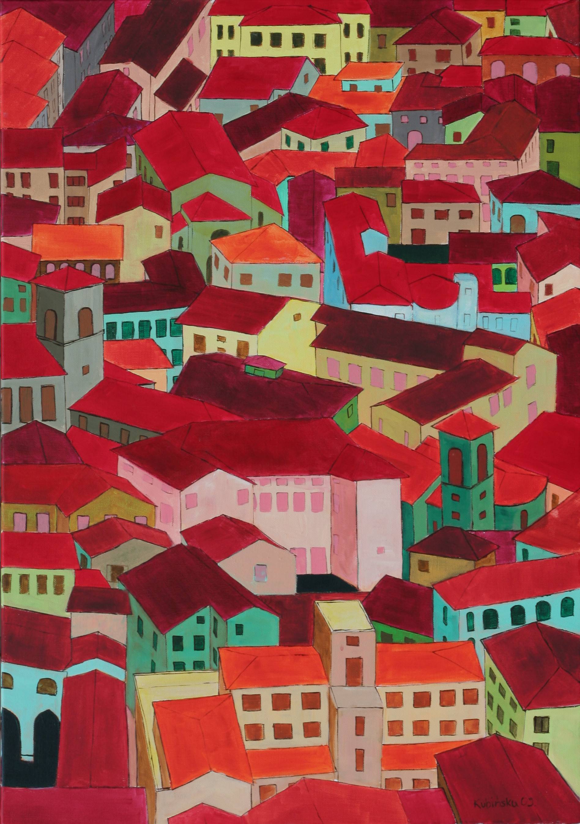 Na tym obrazie widać feerię kolorów. Dominują intensywne czerwienie i pomarańcze dachów, które wręcz eksplodują na tle zielonkawych i niebieskich ścian budynków. Kompozycja jest gęsta, tworząc urbanistyczny labirynt, gdzie każda bryła wydaje się przenikać następną. Jest trochę jak w bajce i trochę jak w zagadce. Artysta używa płaskich plam koloru, przez co całość przypomina kolaż z papieru, nadając obrazowi specyficzny styl cubistyczny. Nastrój dzieła jest dynamiczny i pełen życia. Można poczuć energię miasta w letnim skwarze. Jest tu pewna vibrancy, która może kojarzyć się z rytmem latynoskiej muzyki. Patrząc na ten obraz, czuję jakbym spacerował po krętych uliczkach jakiejś egzotycznej miejscowości. Technika malarska jest zdecydowanie nasycona emocjami. Grube kontury, które oddzielają kolory, dodają charakteru i pewnej zawadiackości. Ta praca pobudza wyobraźnię, narzucając różne interpretacje. Może to być dniem pełnym chaosu albo dowolna chwila zamrożona w barwnej sukni. U mnie wywołuje uśmiech, bo przypomina dziecięce wycinanki. A najfajniejsze jest to, że każdy dom wygląda jak z klocków LEGO.