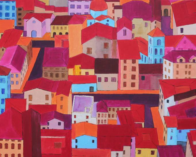 Obraz to prawdziwa eksplozja kolorów. Dominują tu odcienie czerwieni, pomarańczu i niebieskiego, które przeplatają się z pastelowymi różami i fioletami. Domki przypominają klocki, które można by układać w fantazyjne struktury, każdy z czerwoną dachówką jak w bajce. Kompozycja jest ciekawa, pełna geometrycznych kształtów i niespodziewanych kontrastów, dodających obrazowi dynamiki. Atmosfera tej pracy jest lekka i radosna, wywołuje uśmiech na twarzy, nawet jeśli ma się zły dzień. Styl jest nieco naiwny, może przypomina niektóre prace fowistów – intensywność kolorów, odwaga w wyrazie. Artysta nie bał się użyć mocnych plam, które przyciągają wzrok. Technika jest raczej płaska, bez zbędnych detali czy realistycznych smaczków. Każda część obrazu zdaje się żyć własnym życiem. Obraz emanuje ciepłem i zabawą, jakby chciał powiedzieć: "Hej, nie bądź taki serious!" Można sobie wyobrazić, że to tętniące życiem miasteczko, pełne gwaru i śmiechu. A jak popatrzysz dłużej, może ci się zdawać, że słyszysz dzieci bawiące się na uliczkach. Ktoś mógłby pomyśleć: "Ależ tu się dzieje!" i to by było całkiem trafne. Ten obraz przypomina miłe chwile z dzieciństwa, jak budowanie miasteczek z klocków Lego. Małych domków jest dużo i każdy może sobie wybrać ten, w którym chciałby zamieszkać na chwilę. Obraz to prawdziwy "feel-good" painting – coś, co każdy chce mieć na ścianie, żeby poprawił humor.