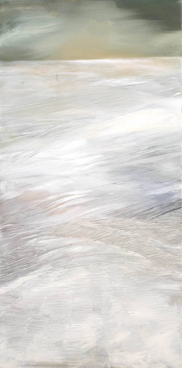Obraz przedstawia subtelny krajobraz, w którym dominują odcienie bieli i szarości, tworzące ethereal atmosphere. Widać delikatne pociągnięcia pędzla, które przypominają falujące fale. Kompozycja jest pełna ruchu, a jednocześnie ma w sobie coś uspokajającego. Niebo jest zachmurzone, z odcieniami szaroniebieskimi, dodając całemu obrazowi spokojnego, niemalże medytacyjnego nastroju. Plamy koloru są miękko rozmyte, co nadaje dziełu abstrakcyjny charakter. Artysta mistrzowsko wykorzystuje łagodne linie, by oddać dynamikę i lekkość. To takie jakby obraz zapraszał do zatracenia się w jego przestrzeni. Dzieło może wywoływać u odbiorcy uczucie nieokreślonej tęsknoty za ciszą i spokojem. Chciałbym tam być, przyglądać się tej nieskończoności, myślimy. Płótno zdaje się mówić: 'Zatrzymaj się na chwilę, odpocznij'. To, co najbardziej zapada w pamięć, to jego prostota i elegancja. Jak mówił mój brat: "To wygląda jak duża chmura w niebie!". To prawda. Czasami najprostsze obrazy niosą ze sobą najwięcej emocji. Czasem wystarczy na nie popatrzeć, żeby poczuć się lepiej.