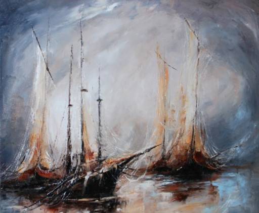 Na obrazie widzimy malowniczy widok z dwoma żaglówkami unoszącymi się na spokojnej wodzie. Kolorystyka jest stonowana, z dominacją szarości i brązów, które mieszają się w miękkich pociągnięciach pędzla. Kształty są nieco rozmyte, co nadaje całości delikatny, impresjonistyczny charakter. Na niebie wiszą ciężkie chmury, które tworzą atmosferę pewnej tajemniczości. Obraz emanuje melancholią i spokojem, na moment zatrzymuje czas. Styl jest luźny, z elementami impresjonizmu, ale z nutą abstrakcji. Technika malarska wydaje się być dynamiczna, z widocznymi śladami szybkich ruchów pędzla, co dodaje energii tej statycznej scenie. Patrząc na ten obraz, można poczuć swego rodzaju freedom, jakby świat zewnętrzny przestał istnieć. Może po prostu chcesz popłynąć w nieznane, zostawiając za sobą codzienne troski. Trochę jak w dzieciństwie, gdy marzyło się o przygodach na morzu. “Żaglówki są super, one pływają po wodzie” – powiedziałby 7-letni odkrywca. Ten obraz prowokuje do zastanowienia się nad podróżą, zarówno tą dosłowną, jak i metaforyczną. Może to także opowieść o poszukiwaniu spokoju wśród burzy, która jeszcze się nie zaczęła. Fascynuje, jak za pomocą tak prostych środków, można przekazać tyle emocji.