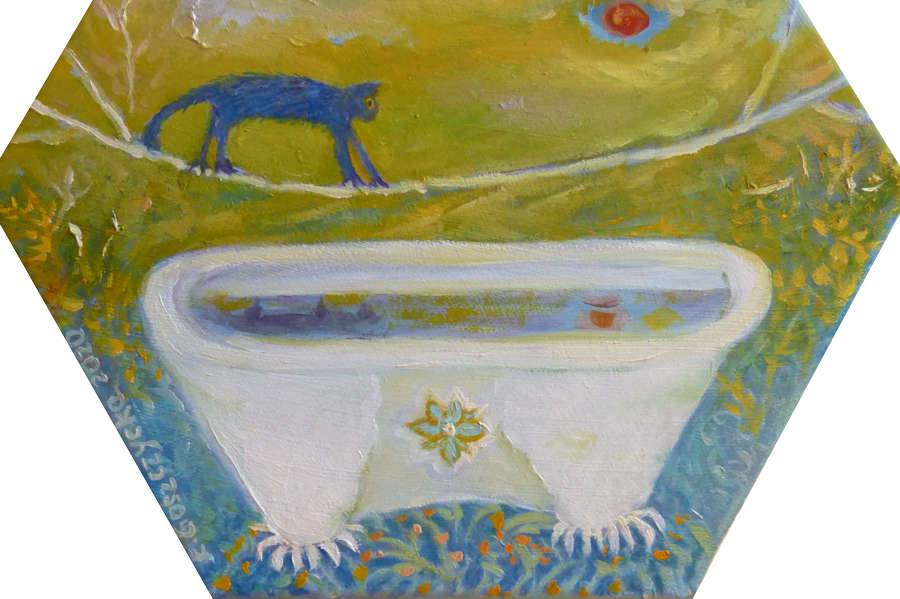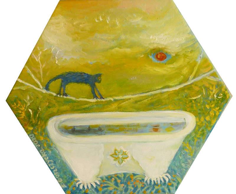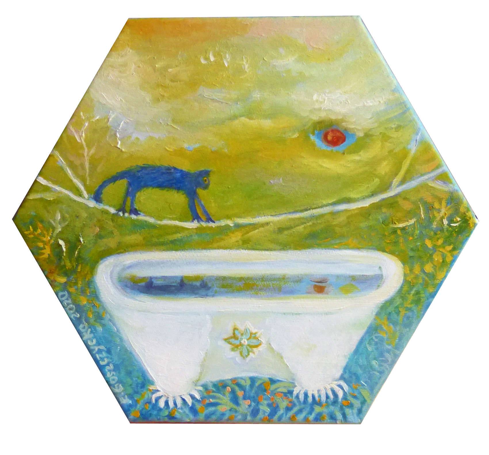 Obraz olejny na sześciobocznym płótnie, wymiary boków po 15 cm. Szerokość w najszerszym miejscu 30 cm, wysokość 25 cm. W pobliżu lewej dolnej krawędzi sygnatura. Boki niebieskie. Obraz gotowy do powieszenia, przed wysyłką zostanie zawerniksowany. Przygoda z czarnym kotem, spacerującym po linie rozwieszonej nad wanną pełną wody. Tło żółte, dół turkusowo-niebieski. Wymiary: 30 x 25 cm Oprawa: bez oprawy, boki zamalowane Rok powstania: 2020