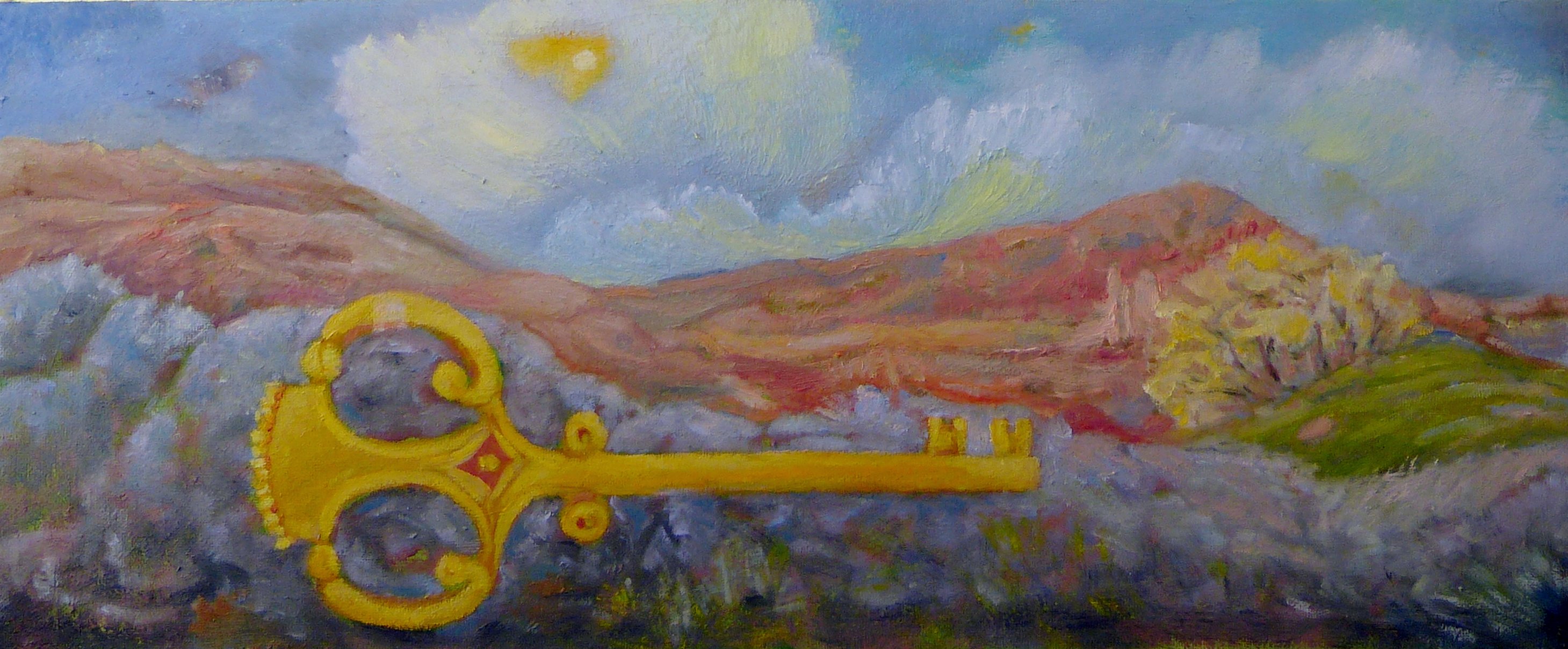 Obraz olejny na płycie. 89 x 37 cm. Gotowy do oprawienia. Duży, złoty klucz w pejzażu. Kompozycja pozioma. Elżbieta Goszczycka 2025