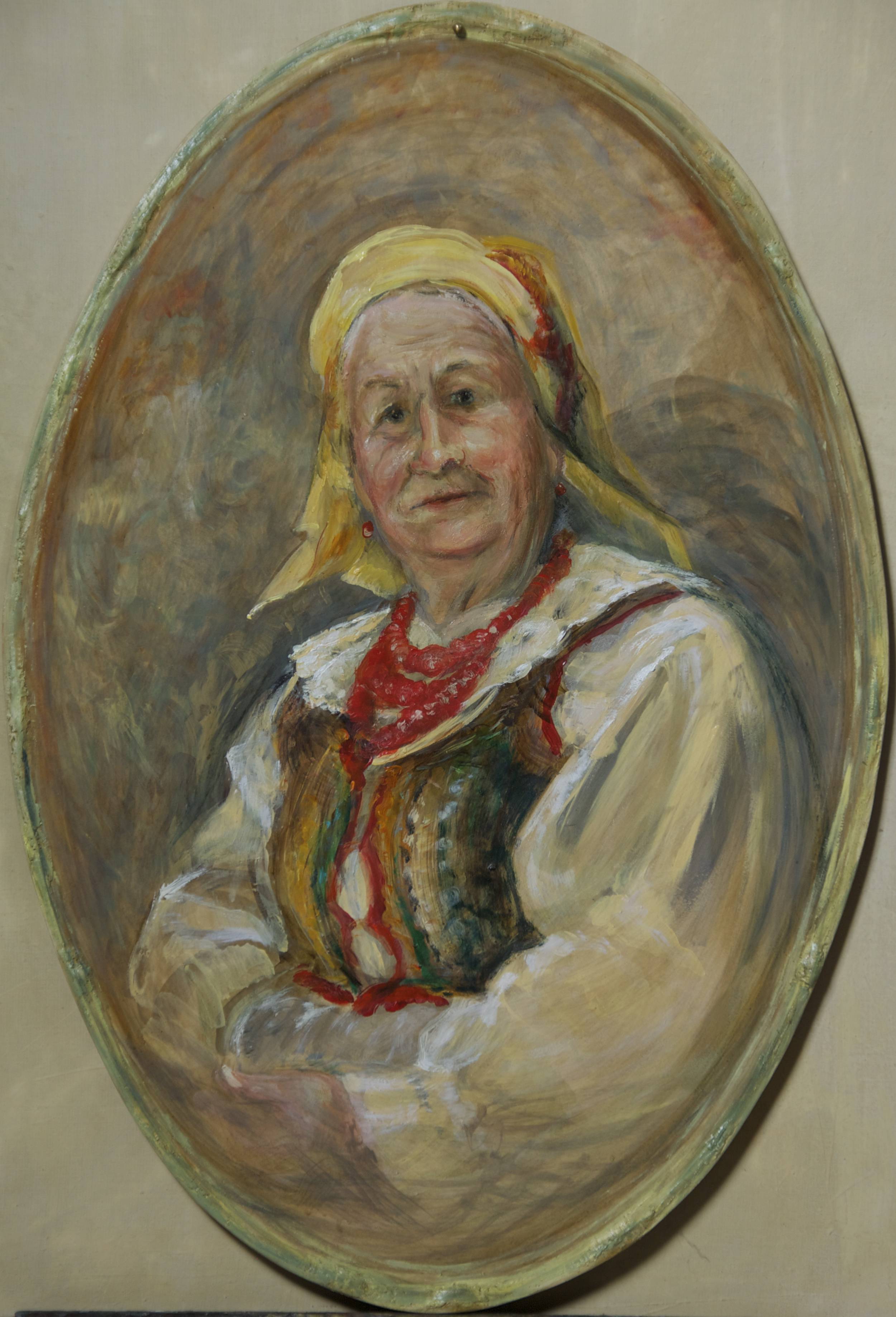 Obraz na sklejce, w kształcie owalu. Technika olejno-żywiczna.