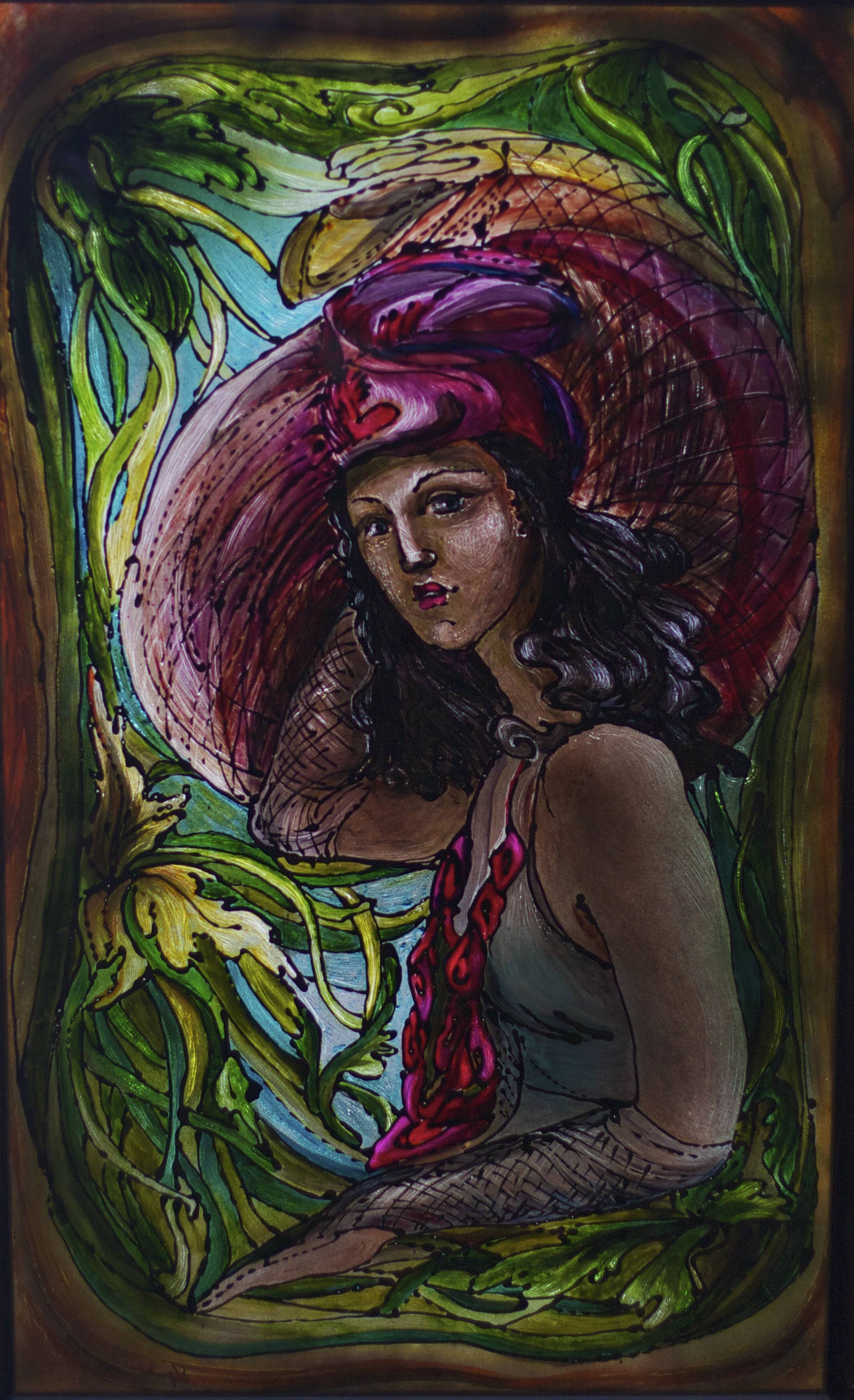 Obraz malowany na szkle. Technika żywiczna. Ekspozycja taka sama jak witraża. W drewnianej, czarnej ramie.