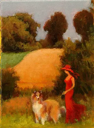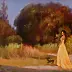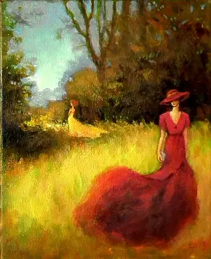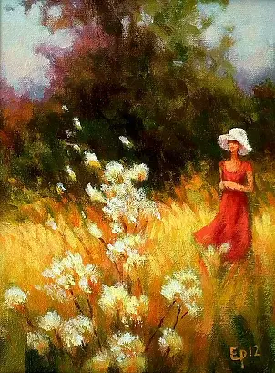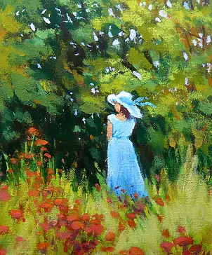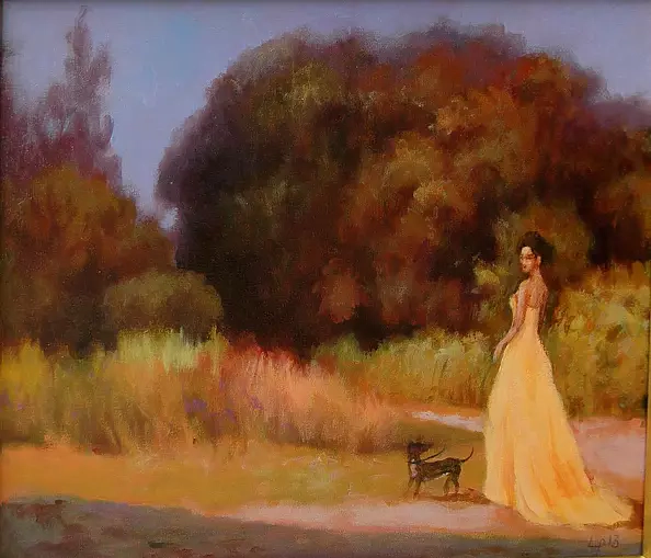 Obraz emanuje spokojem i ciepłym światłem, pokazując scenę, która wręcz pulsuje odcieniami brązu, zieleni i pomarańczu. Dominujące barwy są stonowane, ale jednocześnie pełne życia. Na pierwszym planie widać postać kobiety w jasnej, żółtej sukni, która wyróżnia się na tle bogatej roślinności. Jej sukienka przypomina słońce zagubione w porannym krajobrazie. U jej boku stoi mały piesek, którego czarna sierść kontrastuje z ciepłymi tonami tła. To jakby fragment sielskiego snu. Cała scena utrzymana jest w romantycznym i nieco nostalgicznym nastroju, wzbudzając emocję tęsknoty za beztroskimi chwilami. Artysta zastosował miękkie pociągnięcia pędzla, co dodaje obrazowi eterycznego charakteru. Technika impresjonistyczna sprawia, że dzieło zdaje się migotać w oczach, jakby było pełne ukrytych tajemnic. Patrząc na ten obraz, można poczuć delikatne muśnięcie wiatru i zapach łąki. Dla mnie to jak magiczna opowieść z bajki, którą chciałoby się snuć przed snem. Somebody might call it "dreamy" – tak właśnie się czuję. Małe dziecko mogłoby powiedzieć, że wygląda jak bajka, w której wszystko zawsze dobrze się kończy. To dzieło inspiruje do osobistych refleksji nad pięknem natury i prostotą życia. Wzbudza uczucie pełni i zachwytu nad chwilą, która choć na chwilę unosi w świat marzeń.