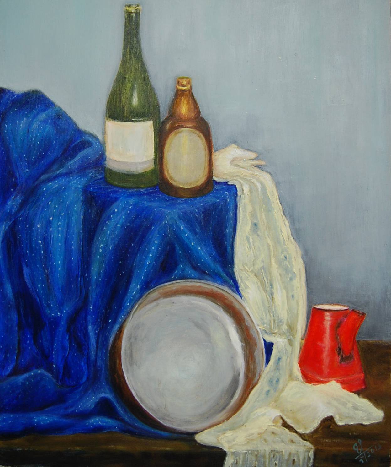 Na obrazie widzimy martwą naturę, gdzie dominują intensywne kolory i zbalansowana kompozycja. Butelki, jedna zielona, druga w odcieniach brązu, stoją dumnie na tle głębokiego, niebieskiego materiału. Tkanina faluje, tworząc miękkie, organiczne kształty, dodając dynamiki i życia. Tuż obok, kontrastuje z nimi biel koronki, delikatnie opadającej z krawędzi, oraz czerwony dzbanek, przyciągający wzrok swoim wyrazistym temperamentem. Całość sprawia, że wnętrze obrazu emanuje spokojem, ale jednocześnie pełne jest tajemnicy. Styl artysty wydaje się klasyczny, z wyraźnymi pociągnięciami pędzla i sferycznym światłem, które subtelnie modeluje obiekty na stole. Patrząc na to dzieło, można odczuwać nostalgia za czasami, kiedy życie toczyło się wolniej. Albo po prostu radość z prostoty rzeczy. „Butelki są nieruchome jak mój kot kiedy śpi” – mogłoby zauważyć dziecko. Obraz wywołuje różnorodne emocje. Dla niektórych to echo domowego ciepła, dla innych symbol harmonii. Love how the red pitcher pops out, adding just the right amount of drama to the scene. I choć z pozoru statyczny, jest jak zaproszenie do zatrzymania się na chwile, by zauważyć piękno w codzienności.