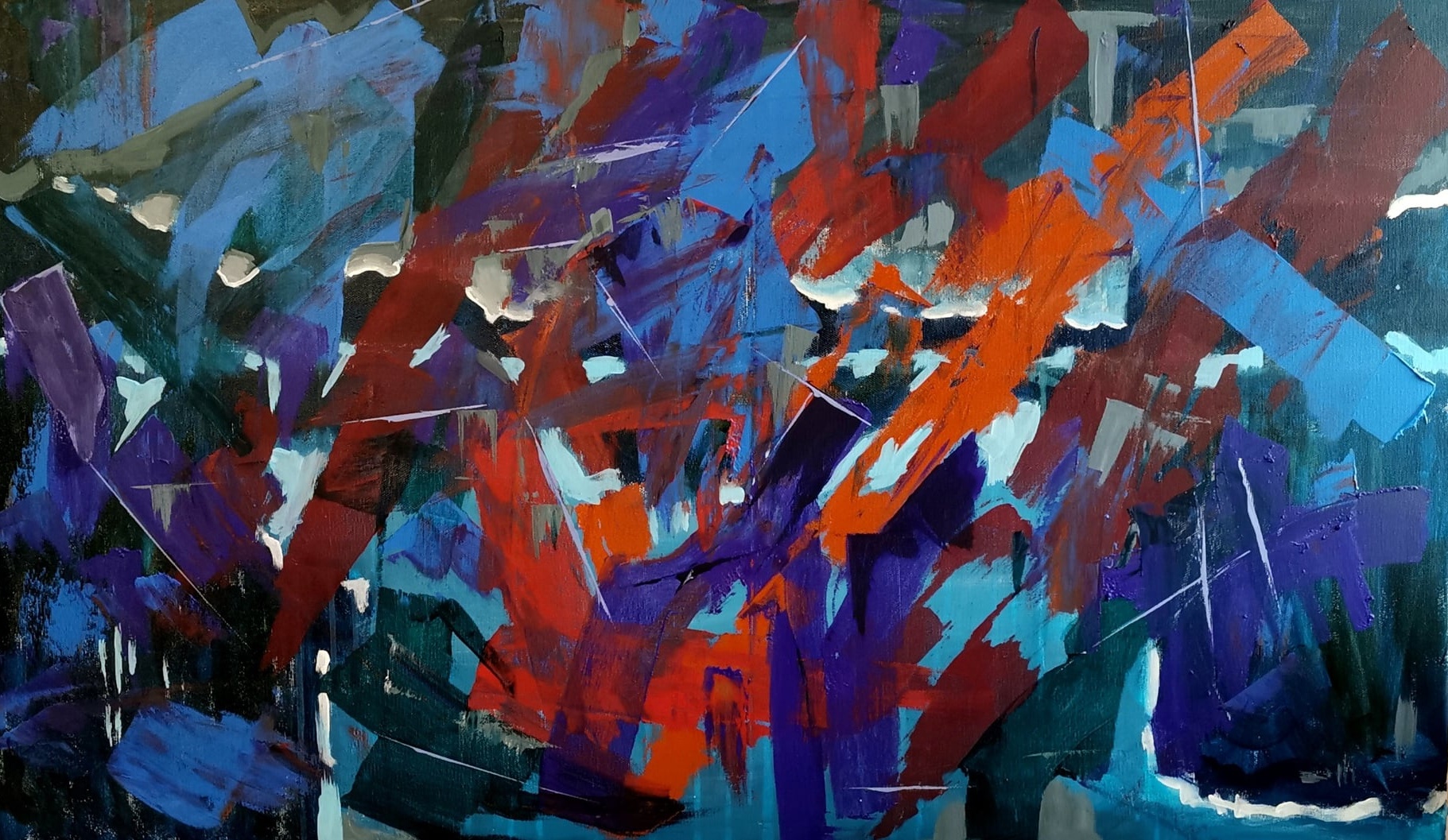Dynamiczna abstrakcja zbudowana z intensywnych barw i energicznych, nakładających się form. Zestawienie głębokich błękitów, czerwieni i pomarańczy tworzy kompozycję pełną ruchu, ekspresji i emocjonalnej głębi. Na płótnie eksploduje mozaika ostrych plam i klinów. Farba kładziona szerokim gestem, czasem jakby zdrapana, z cienkimi rysami, niemal graffiti.