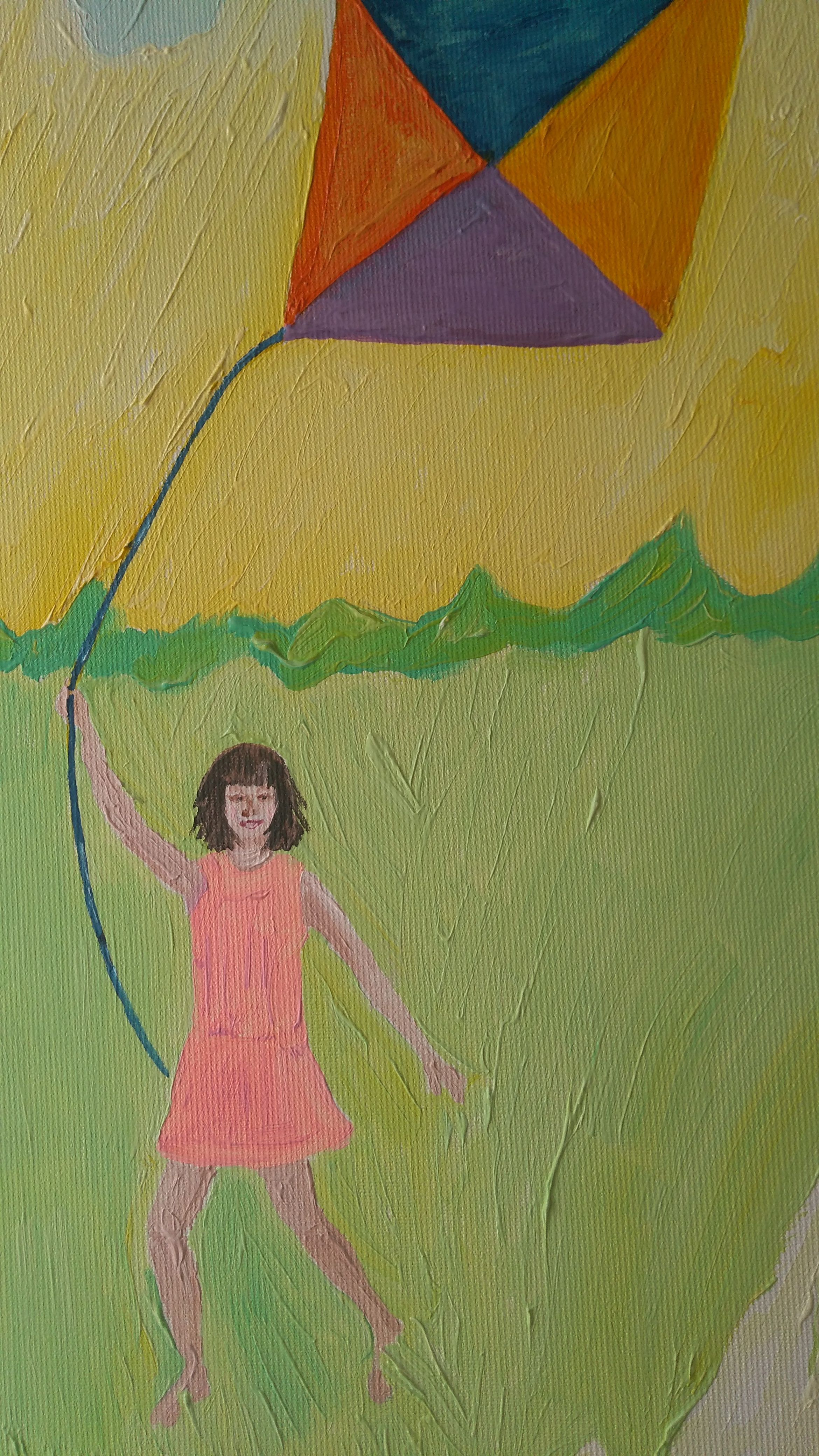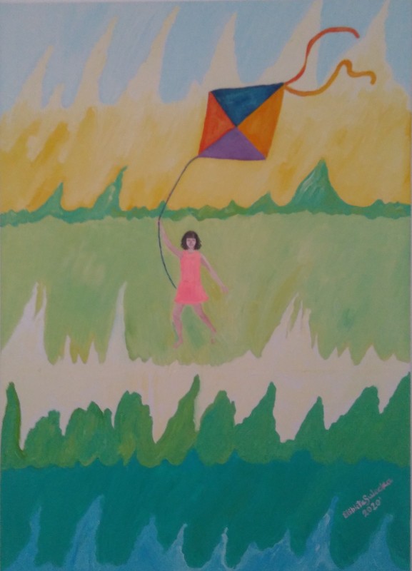Obraz pełen jest energii i radości, przedstawiając małą dziewczynkę bawiącą się na tle żywych, pulsujących kolorów. Dominują tu odcienie zieleni i żółci, które przechodzą w błękitne, pastelowe niebo, tworząc wrażenie bezkresnej przestrzeni i wolności. Czerwonawo-pomarańczowy latawiec, powiewający nad głową dziewczynki, jest wyraźnym focal point'em tego dzieła. Artysta zastosował technikę płaskich plam barwnych, co nadaje obrazowi nieco abstrakcyjnego charakteru i sprawia, że przypomina ilustrację z dziecięcych książek. Atmosfera obrazu emanuje optymizmem, a uśmiech dziewczynki i jej rozpromieniona sylwetka przywołują na myśl beztroskie chwile dzieciństwa. Widać, że artysta skupia się na emocjach, a nie detalach, oddając uczucie radości w rytmach sinusoidy... Moim zdaniem, obraz przypomina piękne wakacje, kiedy wiatr szaleje, a słońce grzeje. Patrzę na to i myślę: Ale by było super móc tak sobie polatać z latawcem! Czuję ciepło i spokój. Wzrok przykuwa ciepło barw, a prostota formy nie pozwala się pogubić w zbyt wielu detalach. Jedno proste "wow" nasuwa się na myśl. Bo to sztuka uchwycenia piękna w everyday moments.