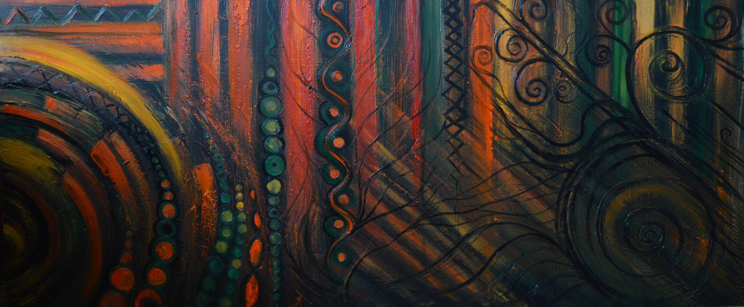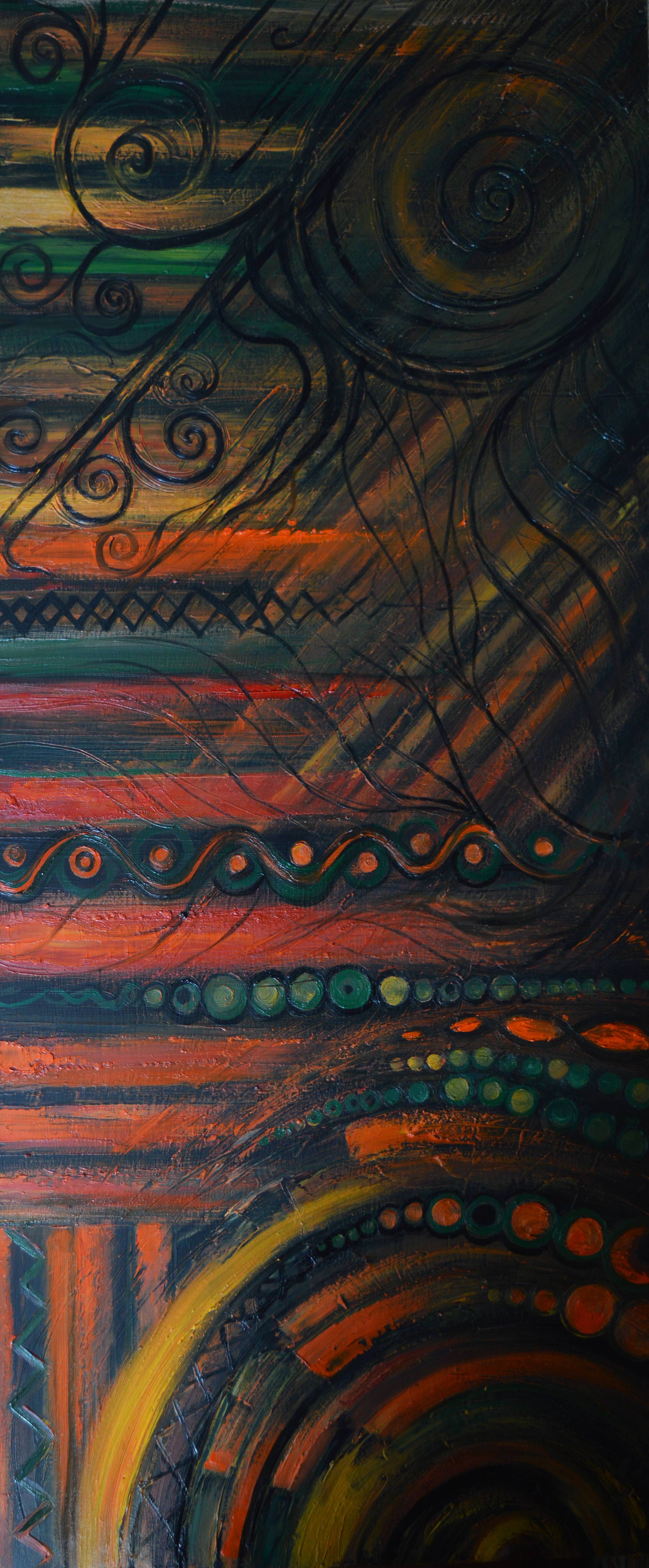 Obraz emanuje intensywną mieszanką kolorów, z dominacją ciepłych odcieni pomarańczu, zieleni i brązu. Te kojące, a zarazem energetyczne barwy zlewają się w skomplikowane wzory, przypominające faliste linie i geometryczne kształty. Artysta zastosował technikę impasto, dzięki której obraz nabiera faktury, a warstwy farby tworzą trójwymiarowe wrażenie. Kompozycja jest dynamiczna, a linie wprowadzają w ruch, który prowadzi nas wzrokiem przez całość dzieła. Spiralne formy i rytmiczne pętle budują atmosferę tajemniczości, a czasem nawet chaosu. Imagine yourself lost in a dream, where wszystko ma inny, nieznany sens. Dzieło to może budzić różnorakie emocje, od ciekawego zapatrzenia, po lekki niepokój związany z jego złożonością. Patrząc na obraz, przypomina mi się jak na podwórku zbierałem kolorowe kamyki. Styl jest ekspresyjny, a może nawet trochę psychodeliczny, co czyni go intrygującym. Artysta zostawia nas z pytaniem o to, co kryje się za tymi wirującymi wzorami i jakie uczucia zostaną obudzone w sercach widzów. Światło i cień odgrywają tu szczególną rolę, tworząc głębię i aranżując grę między jawą a snem.