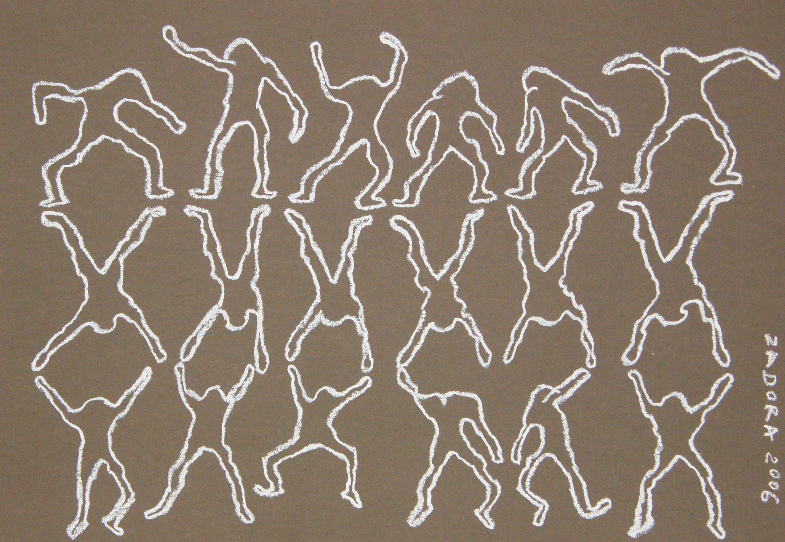 Na obrazie widzimy czarno-białe sylwetki roztańczonych postaci w dynamicznej choreografii. Tło jest brązowe, co nadaje całości surowy, ale ciepły charakter. Postacie są schematycznie narysowane za pomocą białej kredy, co tworzy ciekawy kontrast i dodaje artystycznego wymiaru. Kompozycja to swego rodzaju taneczna mozaika, gdzie każda figura jest jakby zawieszona w ruchu, nadając obrazowi mnóstwo energii. Atmosfera emanuje radością i swobodą, przypomina mi beztroskie chwile na placu zabaw. Artysta zastosował technikę szkicu, która w prostocie wydobywa dynamikę i ruch. Oglądając ten obraz, czuję chęć wstania i dołączenia do tego tanecznego korowodu. Taki "vibe" czuć od razu! Obraz może wywoływać w odbiorcy różne emocje. Dla mnie to czysta eksplozja pozytywności. Moja siostra powiedziała: "Wygląda jak ludki tańczące w kółko!"—a ja się z tym zgadzam bez dwóch zdań. Prosty, a jednocześnie tak angażujący. To dzieło zachęca do chwili refleksji i dostrzeżenia uroku życia w prostych rzeczach. Świetny przykład na to, jak sztuka może mówić bez słów.